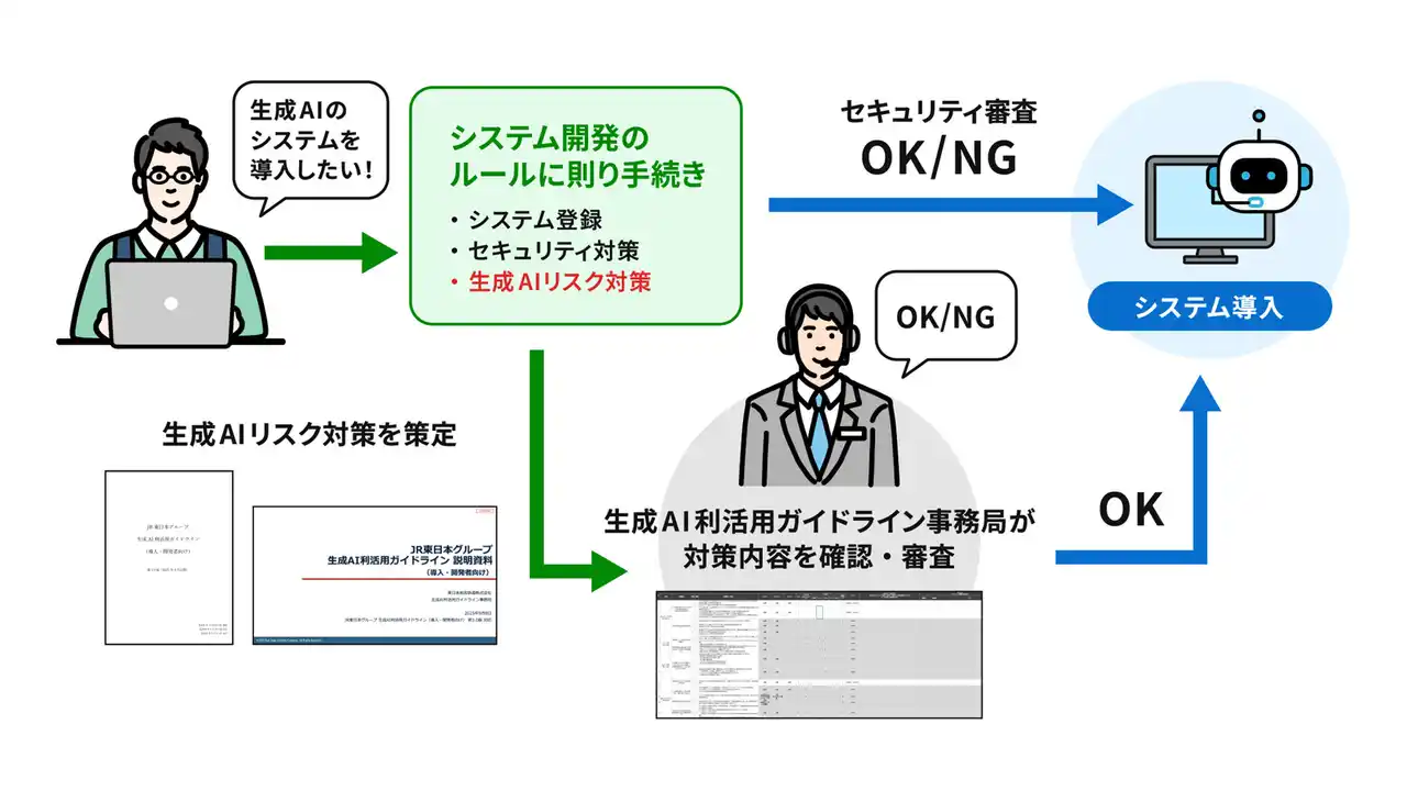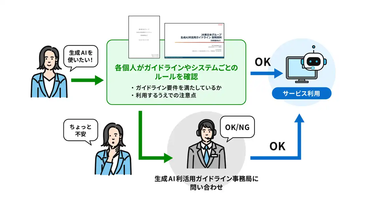 JR東日本グループでは、2023年11月に生成AIを利活用する際に注意する事項をまとめた「JR 東日本グループ 生成AI利活用ガイドライン」を策定しています。2024年3月には、生成AIを利用したシステムを導入・開発する際の注意事項を追加した第2版を発行しました。 |