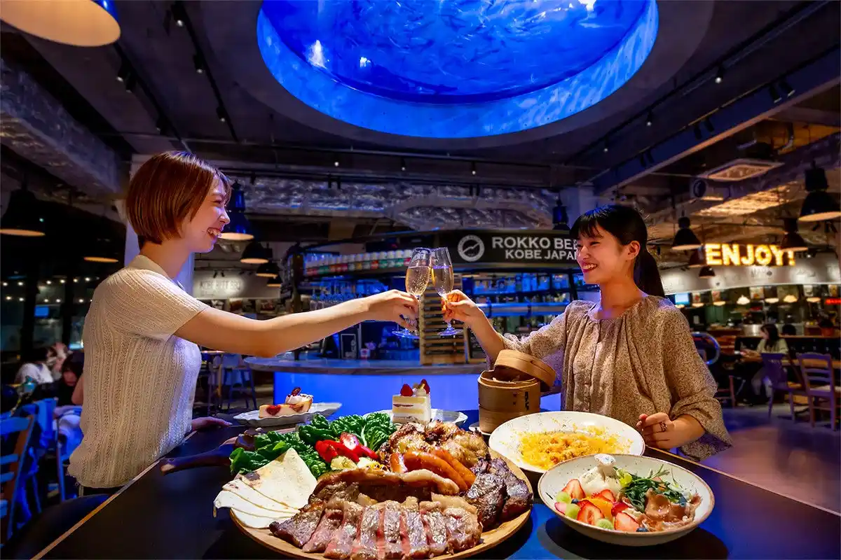 『TOOTH MART 海のビアガーデン2026』最大の魅力は、ご利用シーンに合わせて選べる2つのスタイル。開放的なテラス席では、神戸の海風を感じながらBBQスタイルのビアガーデンを楽しむことができ、約300席ある店内席では、劇場型アクアリウムatoaの巨大水槽を眺めながらゆったりとビアガーデンを楽しむことができます。さらに、全プランに付いてくるミールチケットを使って神戸グルメが味わえる9つのショップで自分好みの”食”を楽しめるのも魅力のひとつ。TOOTH MART FOOD HALLだからこそ体験出来る、その魅力を詳しくご紹介いたします! |