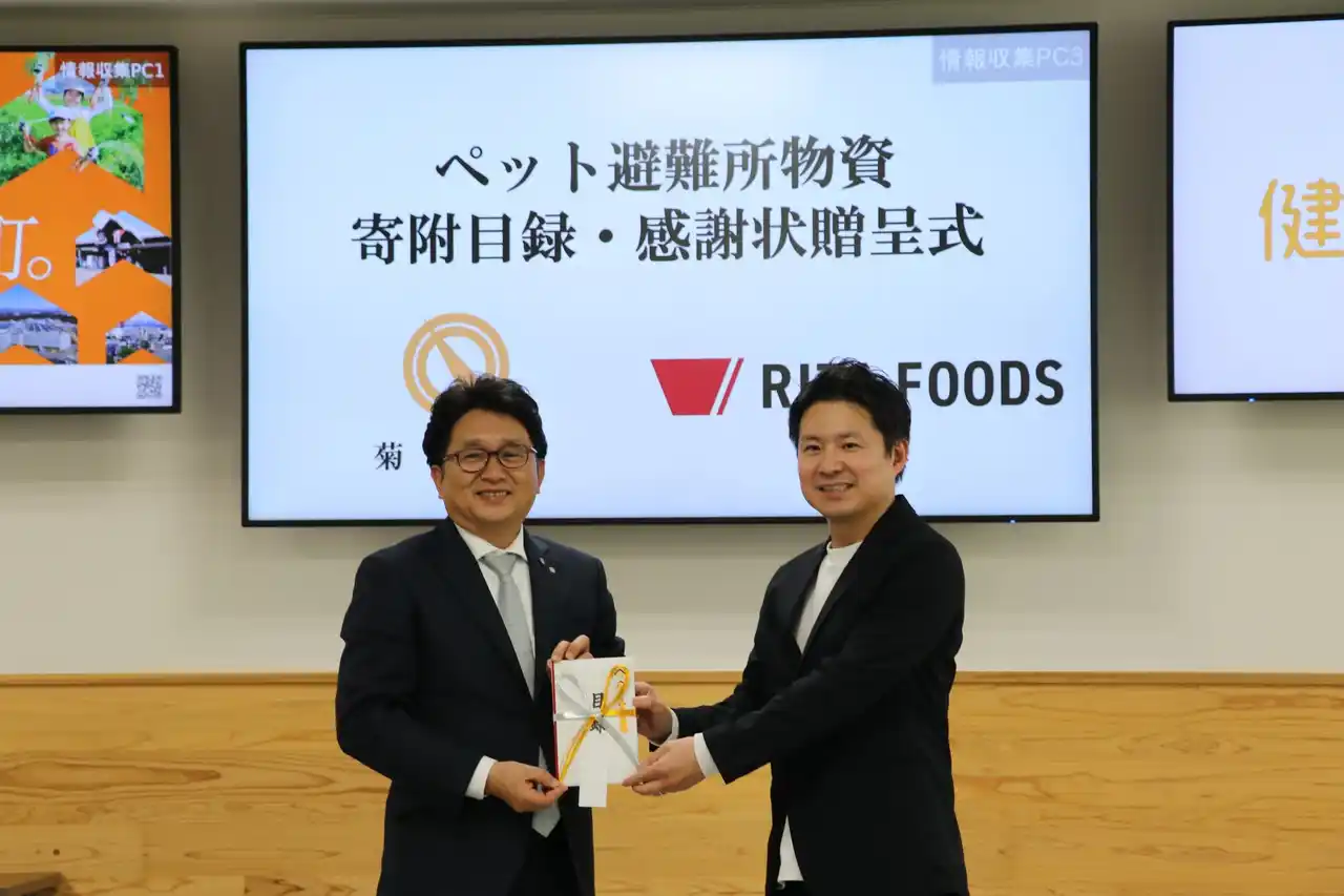 株式会社利他フーズ(代表取締役社長:猪本真也 本社:熊本県熊本市)が運営する、愛犬の健康を食から支えるドッグフードブランド『健康いぬ生活』( https://kenko-dog.com/ )は、熊本地震の発生から10年となる2026年4月15日、熊本県菊陽町へペット専用の防災備蓄物資を寄付し、同日、贈呈式を実施いたしました。 |