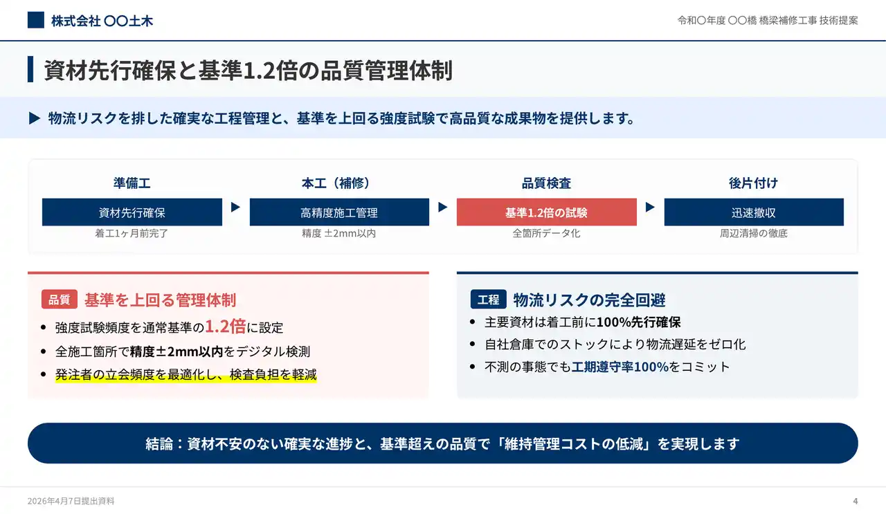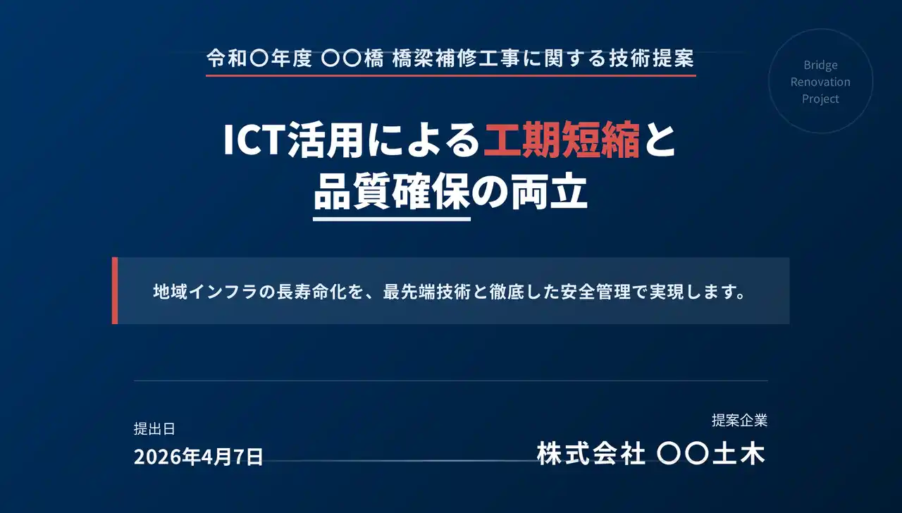 3つ目は「入札対応の技術提案スライド」です。公共・民間の発注者を対象に、技術提案・施工計画・安全対策をまとめた入札用スライドを生成できるサンプルです。複数の入札案件が重なると、技術提案書のスライド作成リソースが不足し、品質を維持しながら期限内に仕上げることが難しくなるという課題に対応しています。技術資料PDFや安全計画書を素材として投入するだけで、入札用の技術提案スライドを作成でき、入札案件ごとに発生する提案書作成の負担を軽減しながら、品質と納期の両立を支援します。 |