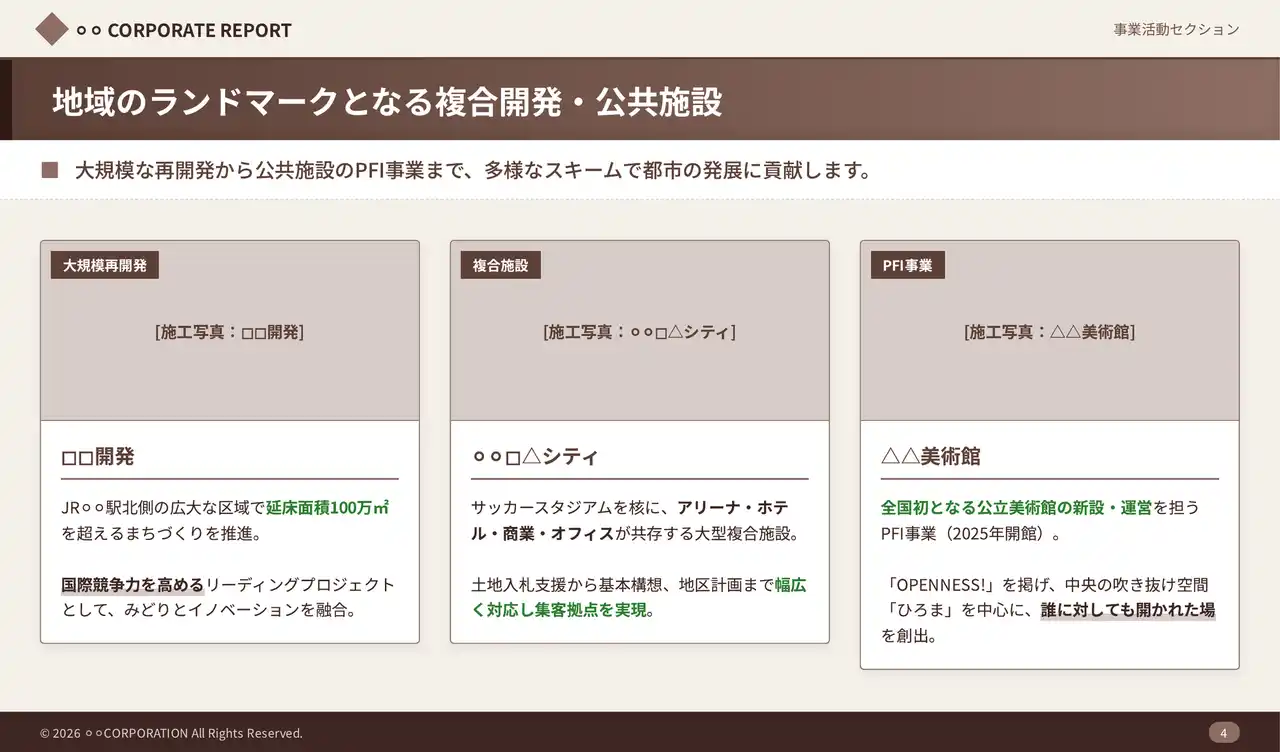 ■施工実績・入札・安全教育に対応する建設業向け5つのサンプルスライド |