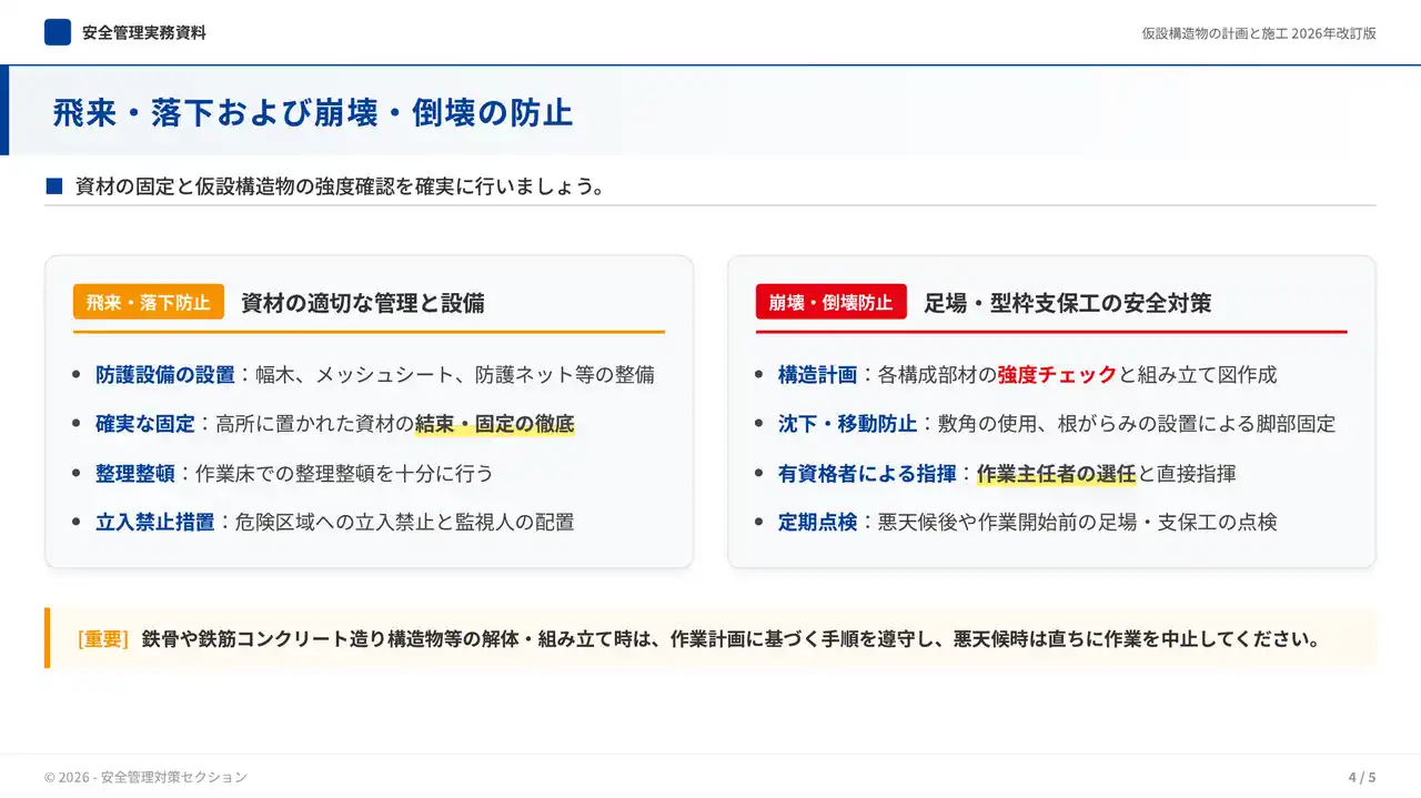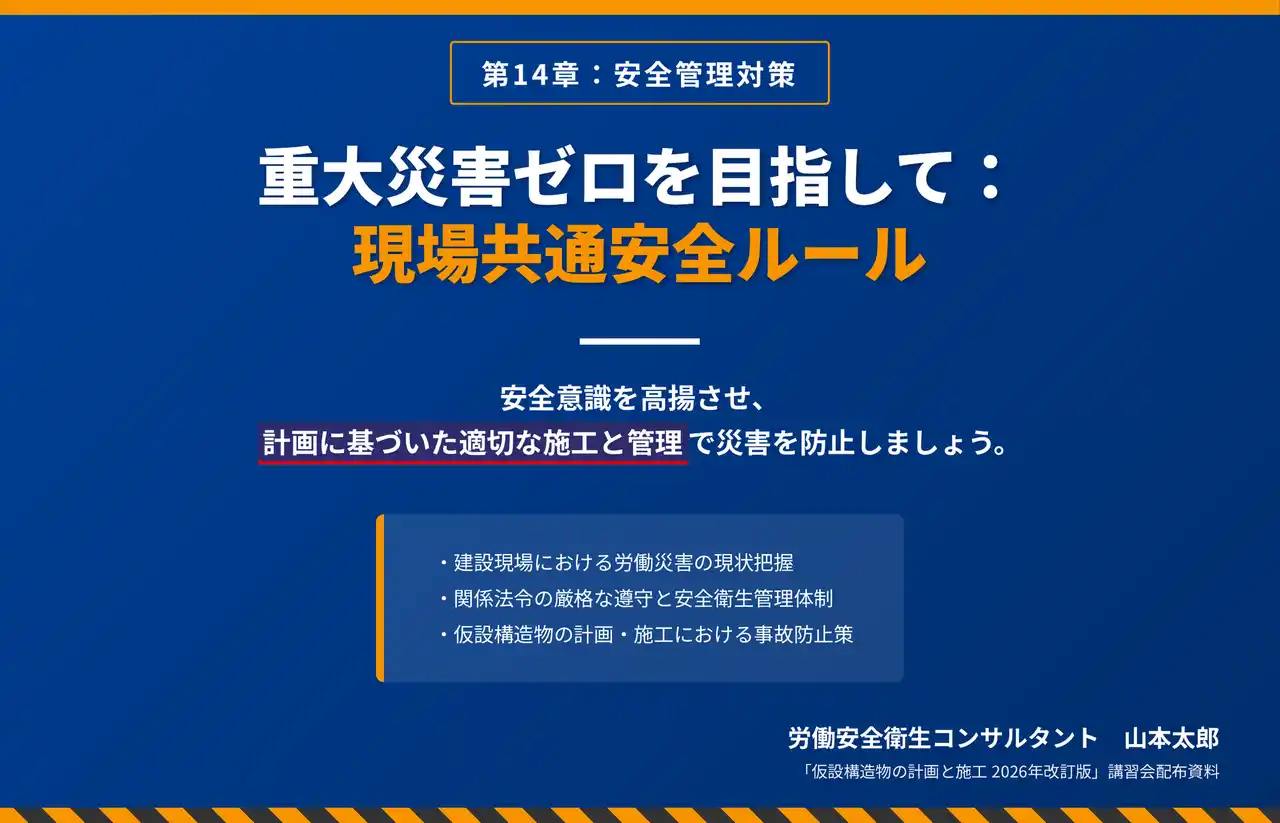 4つ目は「全現場統一の安全教育スライド」です。全現場の作業員・協力会社を対象に、安全基準・事故防止ルールを統一フォーマットでまとめたスライドを生成できるサンプルです。1つのベース安全教育コンテンツを全現場に展開したいものの、現場別の設備・工法に合わせた差し替えに手間がかかり、全現場での品質統一が難しいという課題に対応しています。安全基準書PDFを素材として投入するだけで、安全基準・事故防止ルールを統一フォーマットでまとめたスライドを作成でき、安全大会や新規現場着手時に活用することで、全現場での安全教育の品質を均一化できます。 |