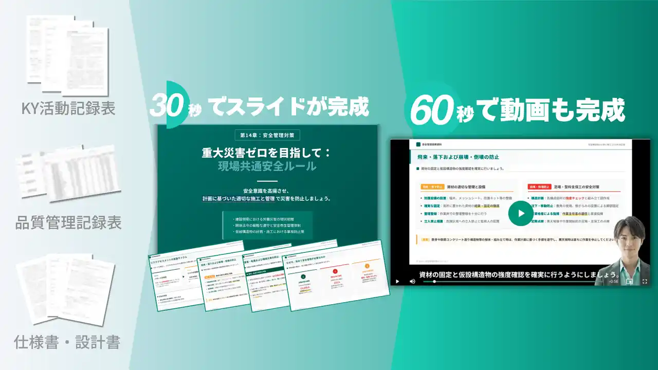 日本発、動画生成AI「NoLang(ノーラン)」を提供する株式会社Mavericks(本社:東京都文京区、代表者:代表取締役社長 奥野 将太)は、この度、NoLangのスライド生成機能において、建設業界向けのサンプルスライドを新たに追加しました。施工実績PDFや安全基準書、技術資料などの既存資料を投入するだけで、図表・グラフ付きのスライドやナレーション付き動画を自動生成。施工実績紹介・入札対応の技術提案・安全教育・経営数値報告・全支店統一の提案フォーマットなど5つの活用シーンに対応しており、就業者数の減少や時間外労働の上限規制が進む建設業界において、入札対応・安全教育・経営報告にかかる資料作成の負担軽減に貢献します。 |