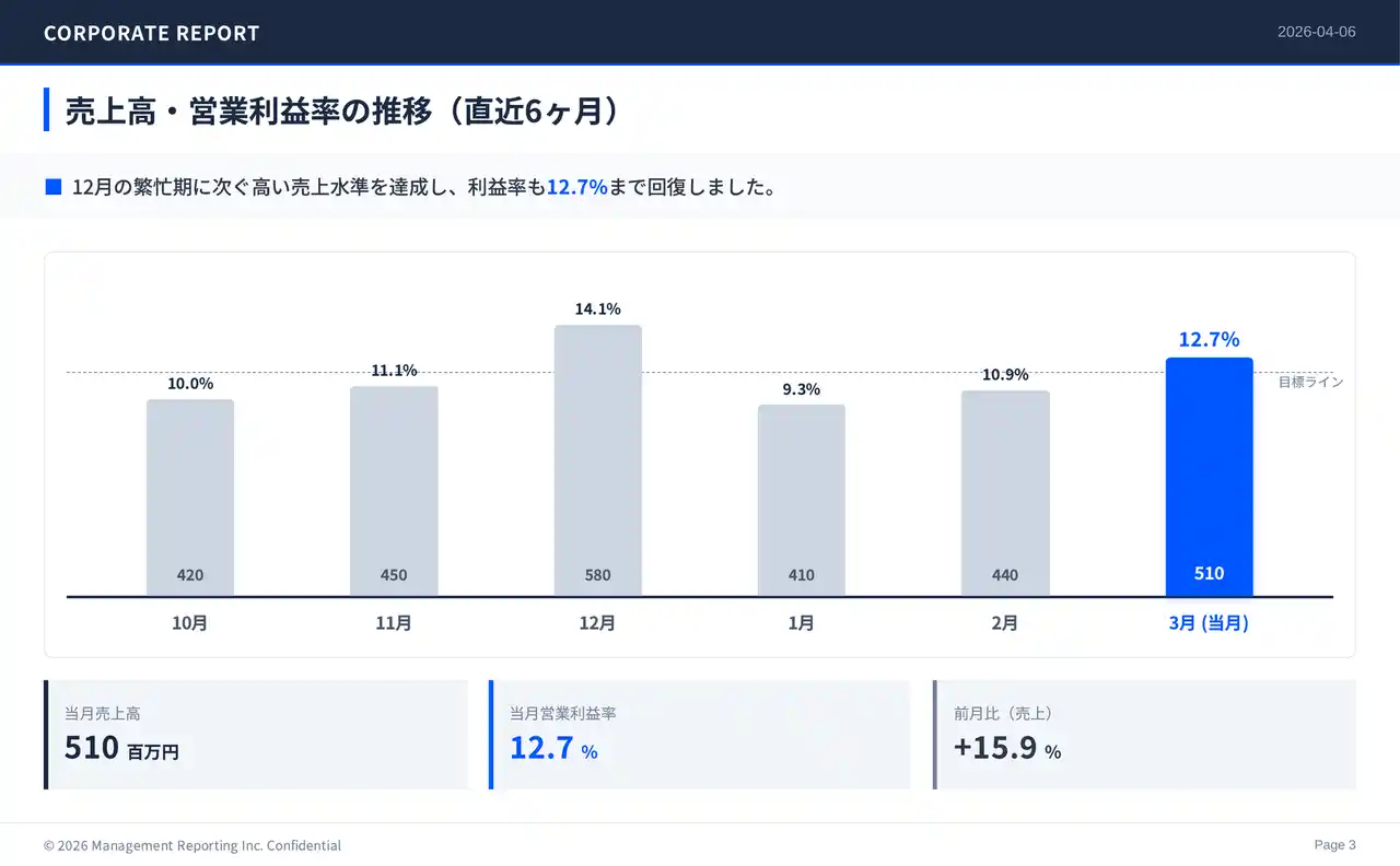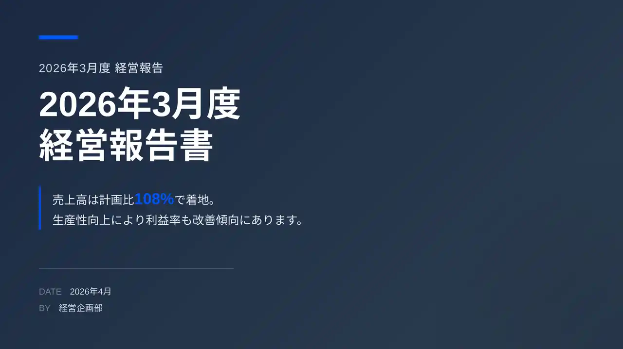 2つ目は「経営数値・社内展開スライド(グラフ付き)」です。経営層・全社員を対象に、月次の経営数値やKPIを棒グラフ・折れ線グラフ・アイコン付きで可視化したスライドを生成できるサンプルです。月次の経営報告をグラフ付きスライドで共有したいものの、経営数値をグラフやチャートに落とし込む作業に手間がかかり、定例資料であっても毎回の制作工数が大きいという課題に対応しています。テキストベースの骨組みをもとに、経営数値・KPIを視覚的に可視化したスライドを自動生成でき、月次経営会議や全社共有の場で活用することで、定例報告資料の制作負担を継続的に軽減できます。 |