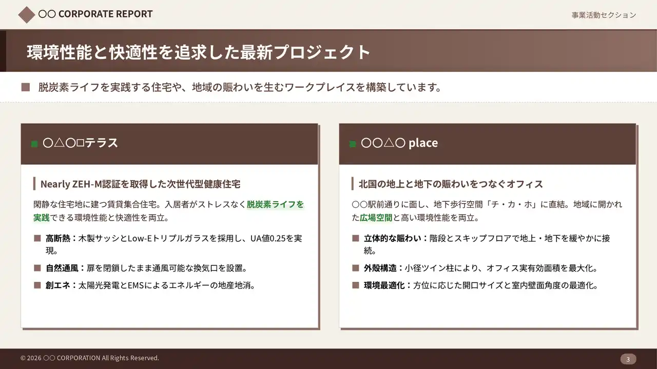 建設会社・工務店・設備工事会社など、建設業界のさまざまなシーンでの活用を想定したサンプルスライドを用意しており、専門的なデザインスキルがなくても、高品質な提案資料・教育コンテンツを制作することが可能です。 |