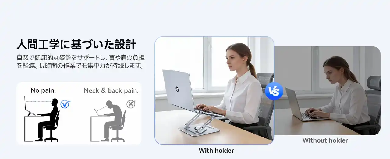デスクワークで首や肩がバキバキになっていませんか? ノートパソコンの画面を理想的な高さに持ち上げるだけで、姿勢は劇的に改善されます。 |