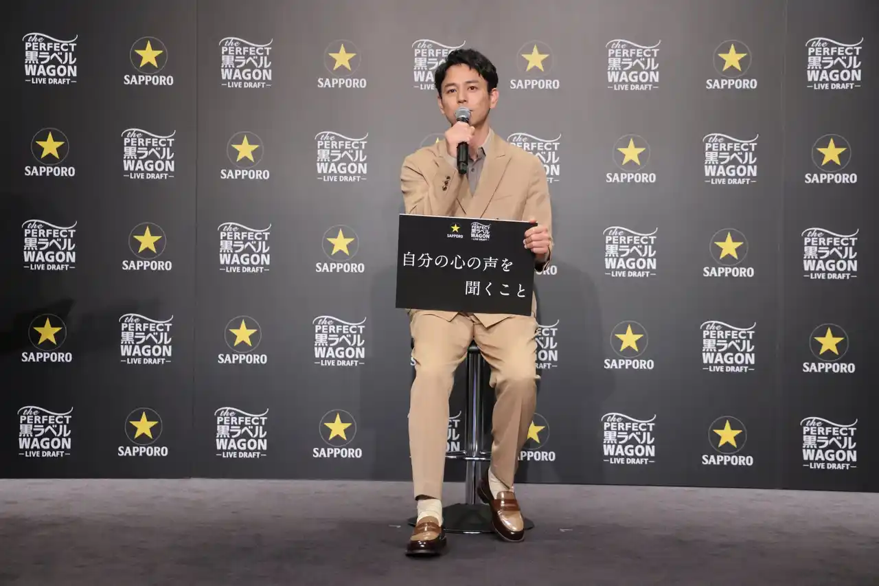 トークセッションの終盤では、サッポロ生ビール黒ラベルのブランドメッセージ “丸くなるな、☆星になれ”を発信している、妻夫木聡さんから「自分らしくいる為に大切にしていること」をテーマにフリップを使って発表。妻夫木さんは「自分の心の声を聞くこと」と掲げました。その言葉に込めた思いについて「世の中、頑張っていない人はいないと思います。ついつい弱い自分に蓋をして頑張りすぎちゃう瞬間があると思います。1日1日ほんの少しでも自分の心の声を聞く時間が大事になると思います。」と語りました。 |
