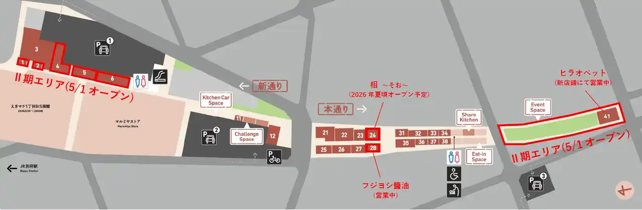 JR九州ビルマネジメント株式会社(本社:福岡市博多区、代表取締役社長執行役員:古賀 大貴)が推進しております『べっぷ駅市場』リニューアルプロジェクトについて、2025年秋より先行オープンしておりましたI期エリアに加え、II期エリアに新たな5店舗を迎え、5月1日に全てのエリアが開業し合計で20店舗が開業することをお知らせいたします。 |