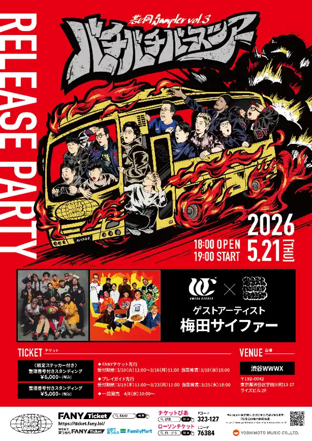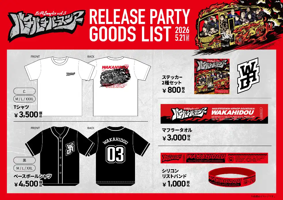 本作のリリースを記念し、5月21日(木)には渋谷WWWXにて、ゲストに梅田サイファーを迎えた、若ヒ同史上最大規模のリリースパーティー『若ヒ同Sampler Vol.3 バチバチバースツアー RELEASE PARTY』を開催。本日、会場で販売されるグッズのラインナップも一挙解禁しました。 |