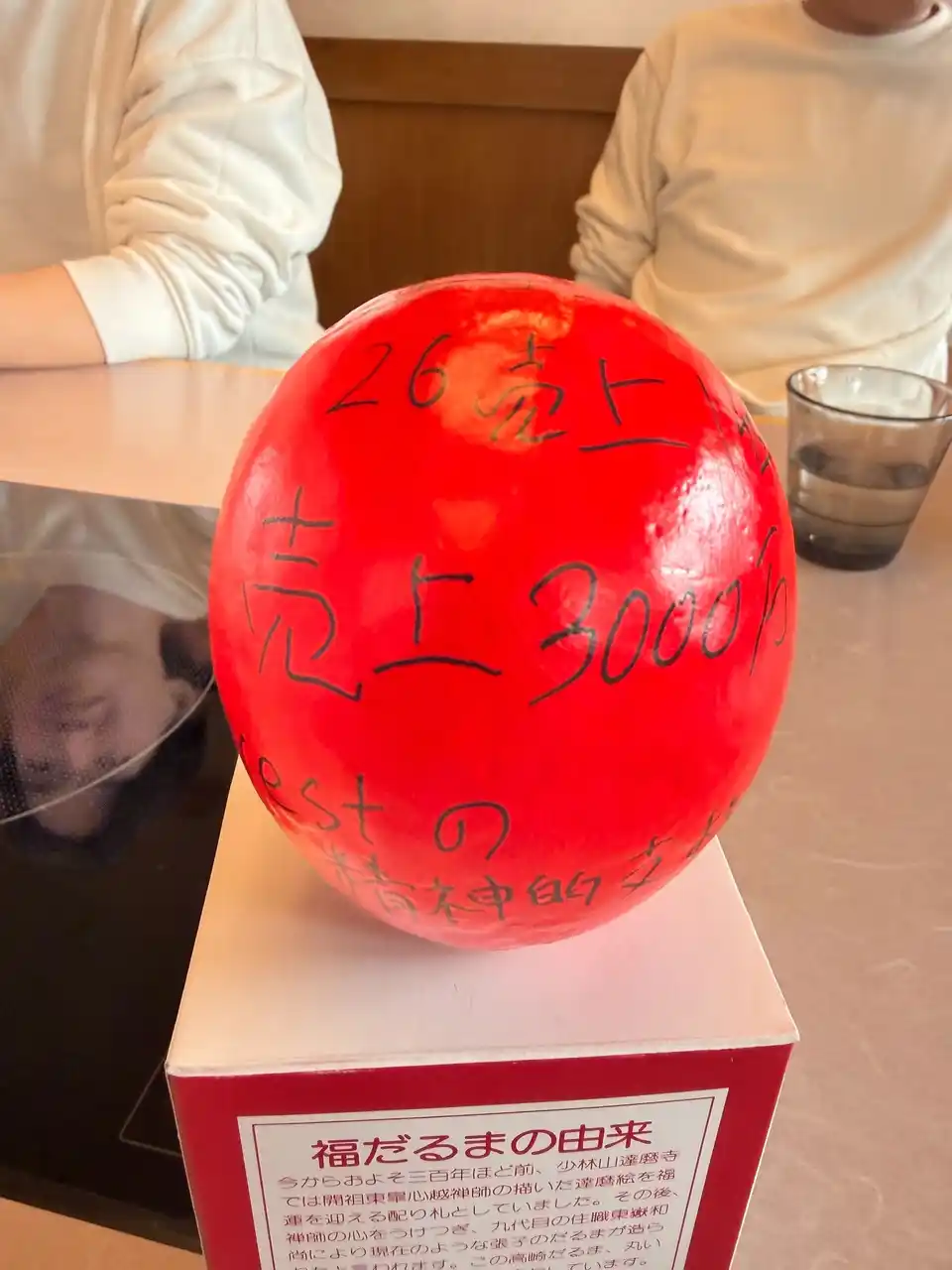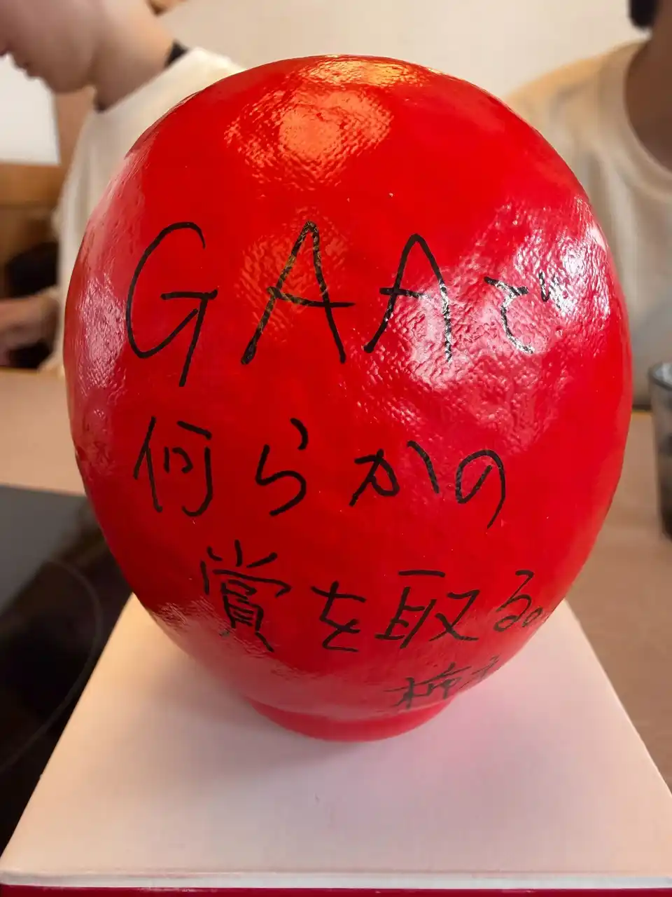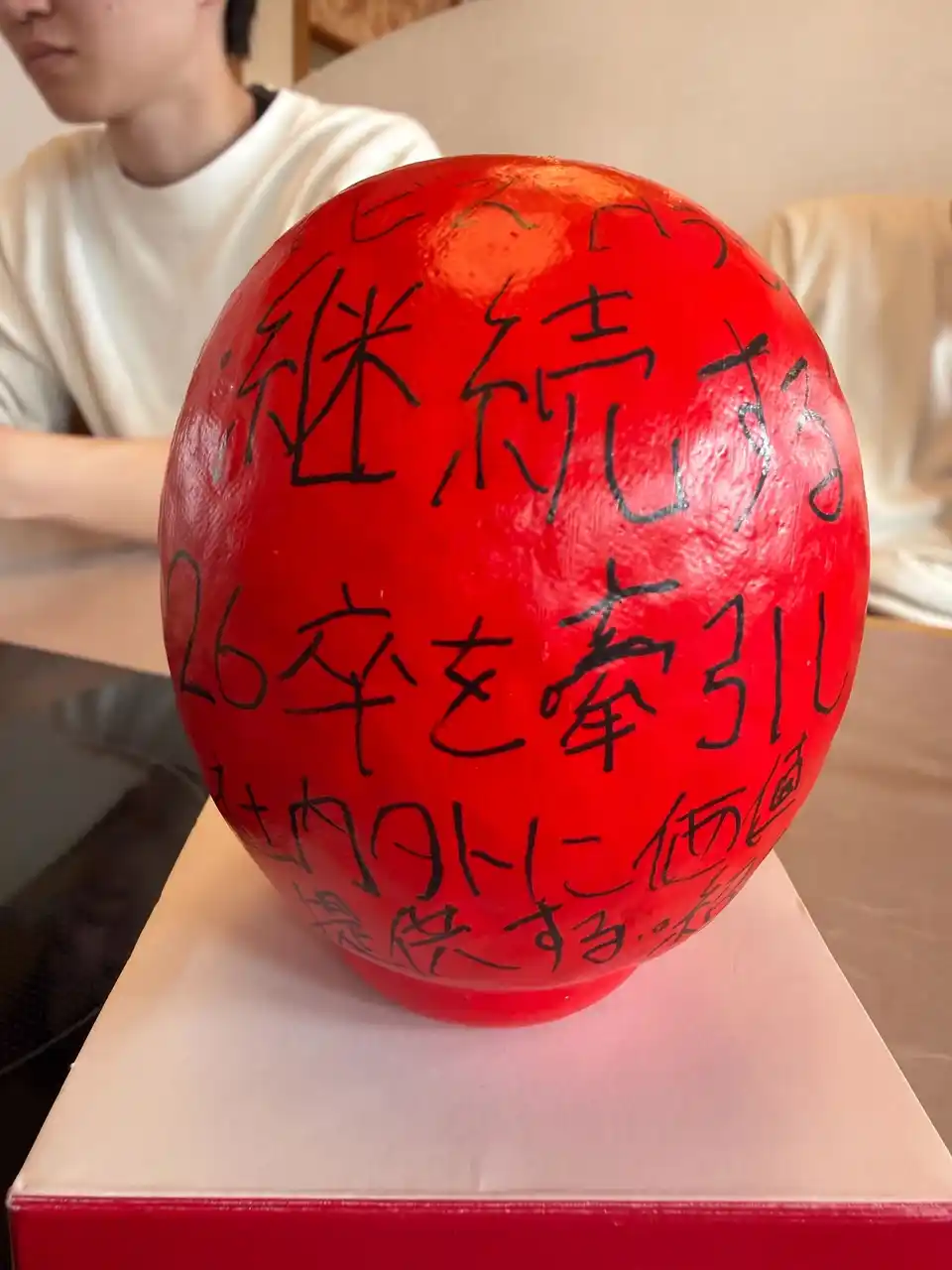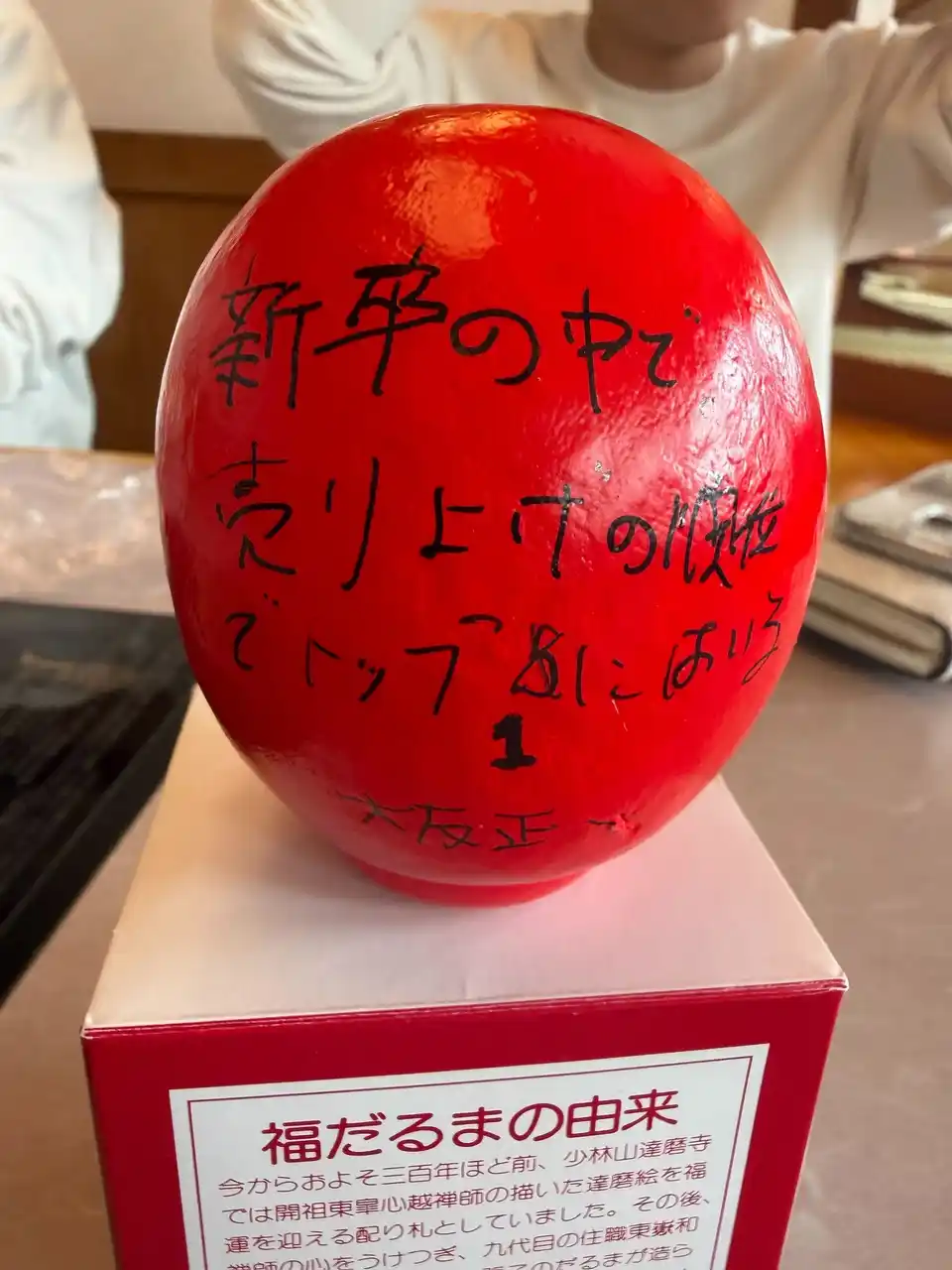 各自が「この1年間で成し遂げること」をだるまに記入。目標達成を自分に約束するため、その場で願いを込めて「左目」を入れました。残る右目は、1年後に目標を達成した際に自分たちの手で入れることを誓っています。 |