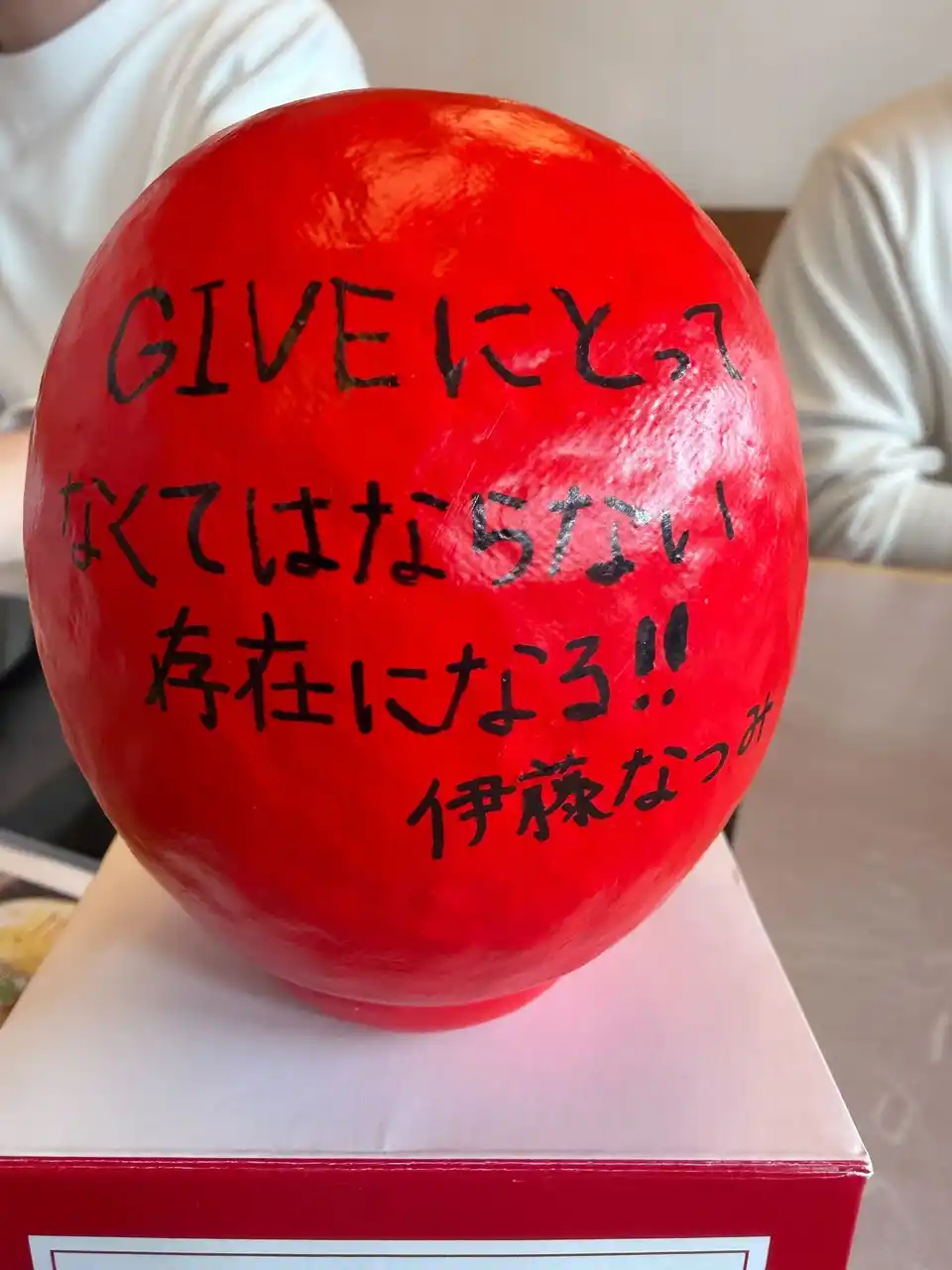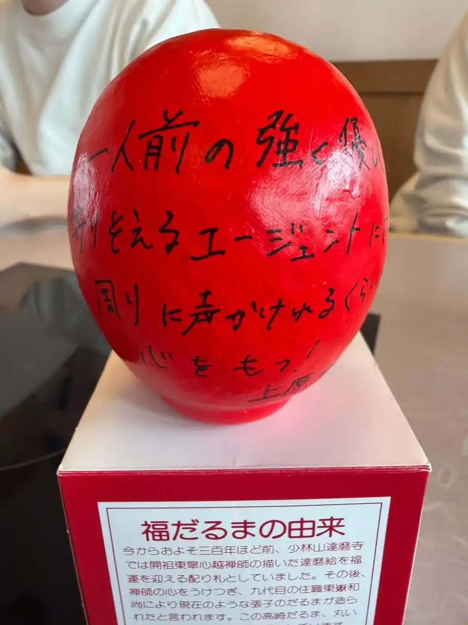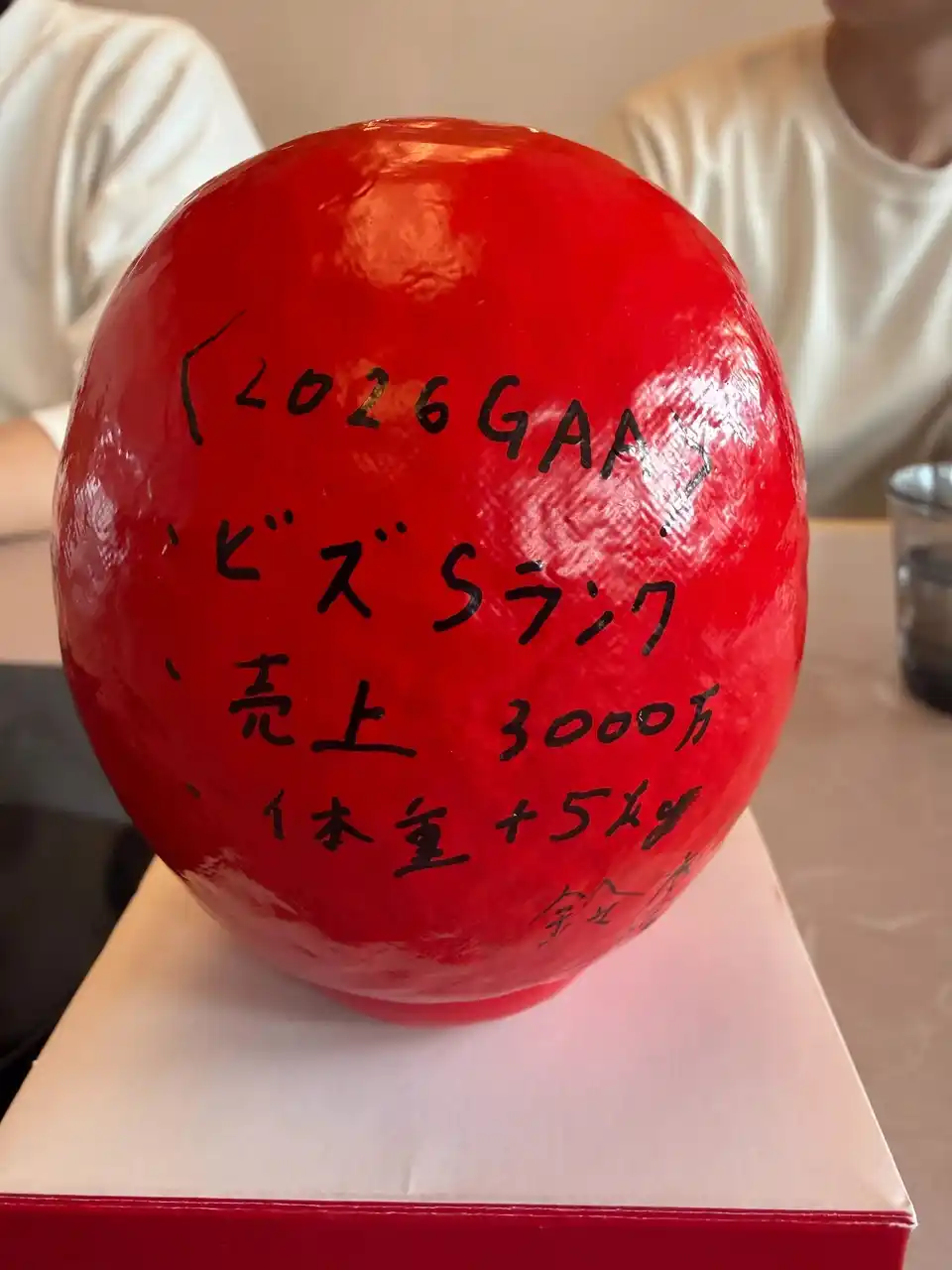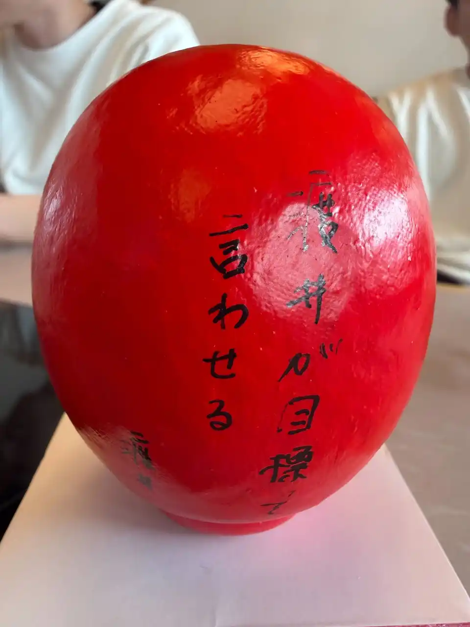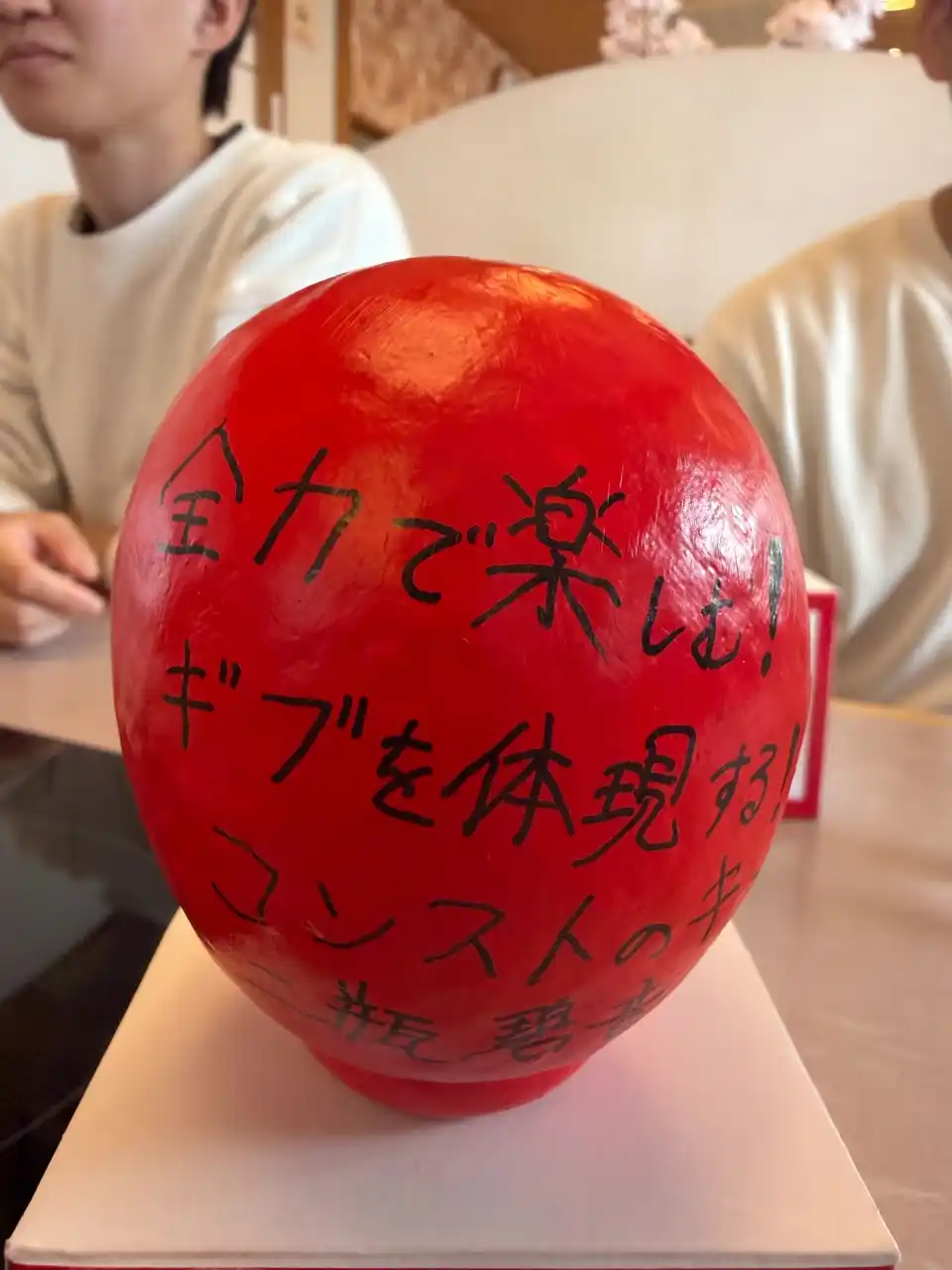 各自が「この1年間で成し遂げること」をだるまに記入。目標達成を自分に約束するため、その場で願いを込めて「左目」を入れました。残る右目は、1年後に目標を達成した際に自分たちの手で入れることを誓っています。 |