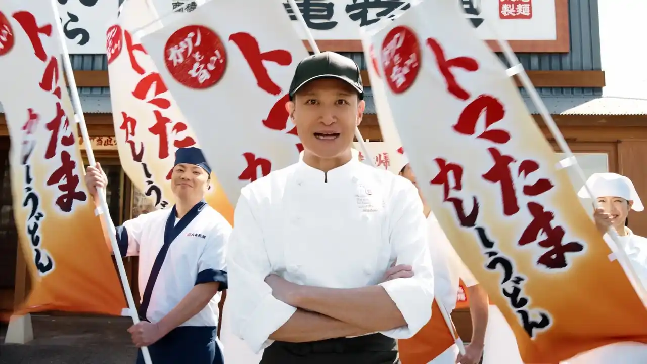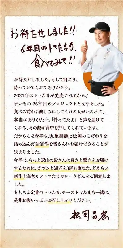 丸亀製麺の実店舗で撮影された今回の新TVCMは、丸亀製麺の開発チームと同じコックコートに身を包んだ松岡さんの「おーい!今年もきたぞー!」という力強い呼び声からスタート。のぼりが風になびく様子や、麺職人たちの表情から「トマたまカレーうどんシリーズ」が帰ってきたことへの期待感が伝わります。新作『海老カツトマたまカレーうどん』の海老カツを揚げるシーンでは、丸亀製麺と共同開発者である松岡さんのこだわり抜いた一杯が生み出される瞬間の臨場感が描き出されています。