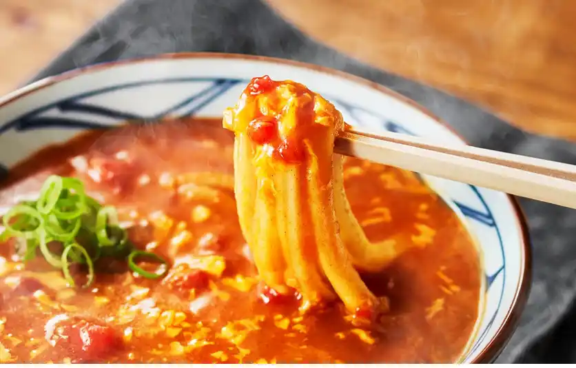 一軒一軒が製麺所である丸亀製麺では、創業以来、毎日すべての店で、北海道産小麦、塩、水のみから打つうどんを提供しています。麺職人※が全店に配置され、磨きがかかった「打ち立て・生」のうどんは、トマたまカレーにも海老カツにも負けない存在感。 |