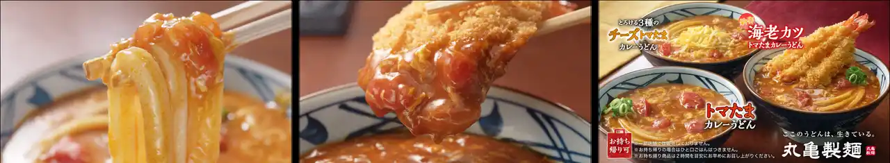 「トマたまカレーうどんシリーズ」初※となる魚介のバランスを考え抜きたどり着いた、『海老カツトマたまカレーうどん』と、人気の『トマたまカレーうどん』『とろける3種のチーズトマたまカレーうどん』を味わえるのは今だけ。ぜひ、進化を続ける『トマたまカレーうどん』をお楽しみください。 |