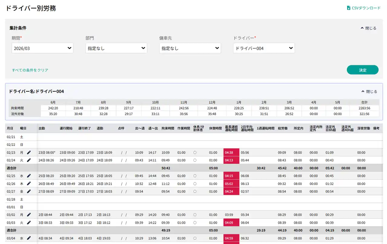 また、改善基準告示や労働基準法に照らして注意が必要な労働時間がある場合は、アラートで通知されます。これにより、管理者はリスクを早期に把握し、是正に向けた対応を迅速に進められます。 |