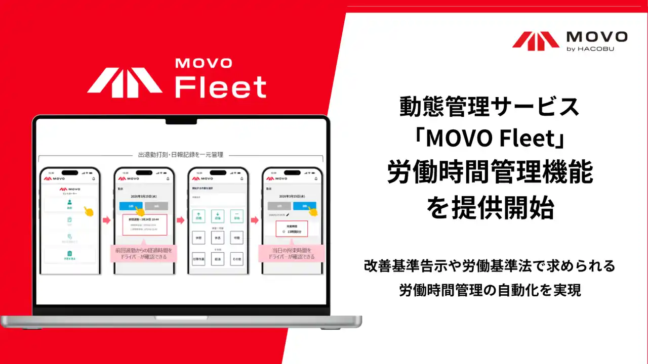 データの力で物流課題を解決する株式会社Hacobuは、動態管理サービス「MOVO Fleet(ムーボ・フリート)」において、「労働時間管理機能」を提供開始いたしました。MOVO Fleetの日報作成機能に、今回提供を開始した出退勤打刻機能を組み合わせることで、トラックドライバーの労働時間を集計するために必要な情報を、MOVO Fleet上でまとめて管理できるようになります。これにより、改善基準告示や労働基準法で求められる労働時間管理を自動化しやすくなります。さらに、複数のシステムやツールに情報を転記する手間が減り、適切な労働時間管理ができないといった課題の解決につながります。 |