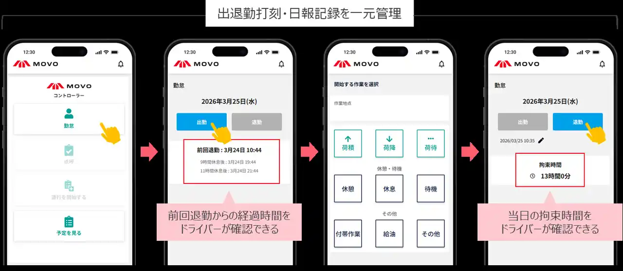 なお、本機能はMOVO Fleetの「モバイルコントローラーオプション」および「労働時間管理オプション」をご利用の企業にお使いいただけます。 |