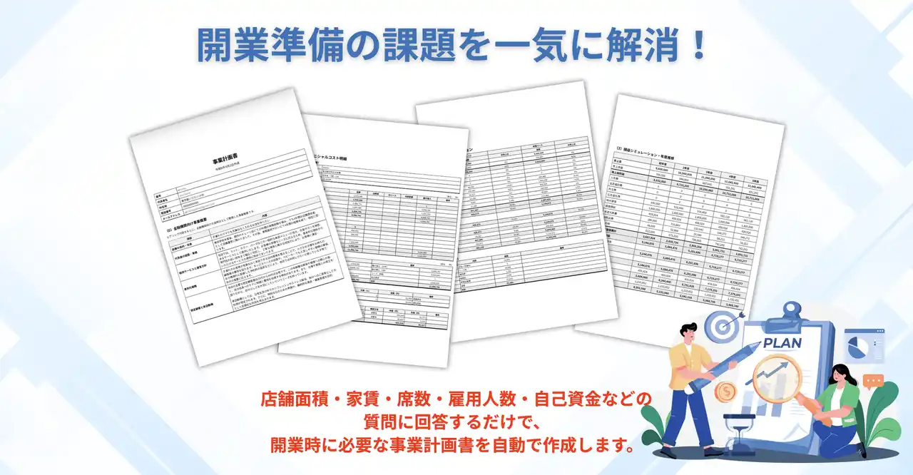 本サービスでは、店舗面積・家賃・席数・雇用人数・人件費・自己資金などの質問に回答するだけで、事業計画書を自動で作成することができます。 |