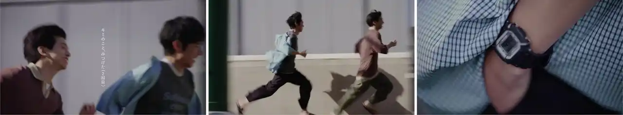 映画の時間まであと5分、走っている二人。「それ良くね?」「ん?」「時計」「ああ、むかし買ったやつ」一人がつけている腕時計に、もう一人が目を留めます。「久しぶりにつけたら、今ありじゃんって」「確かに、よくつけてたわ」話題は、その時計をよくつけていた高校時代の思い出話へ。「あの頃、夜中にチャリで海まで行ったよな。二人で」「うん。それ俺じゃないな」「うそ。…てかこれ、お前も似合うよ。つける?」「いま間違えたよな」「ううん」愛用していた時計との“2回目の出会い”をきっかけに、二人の飾らない関係性が垣間見えます。 |