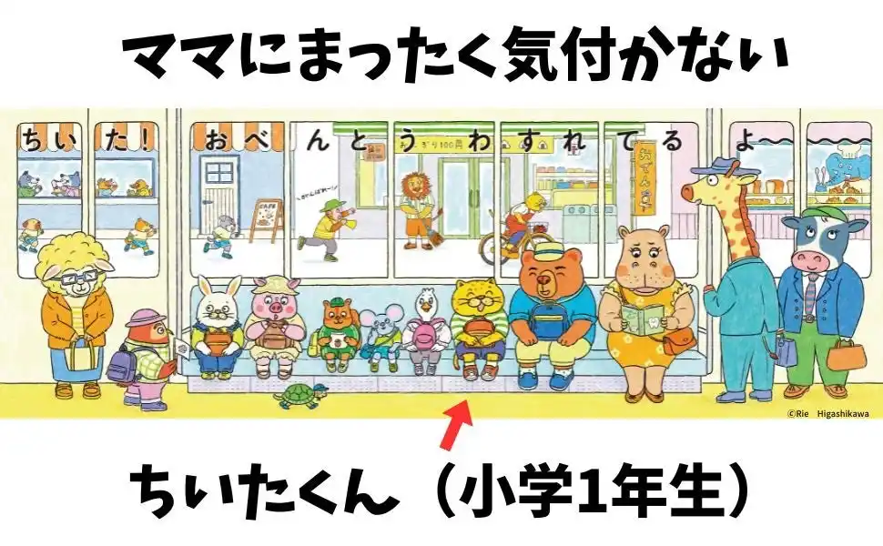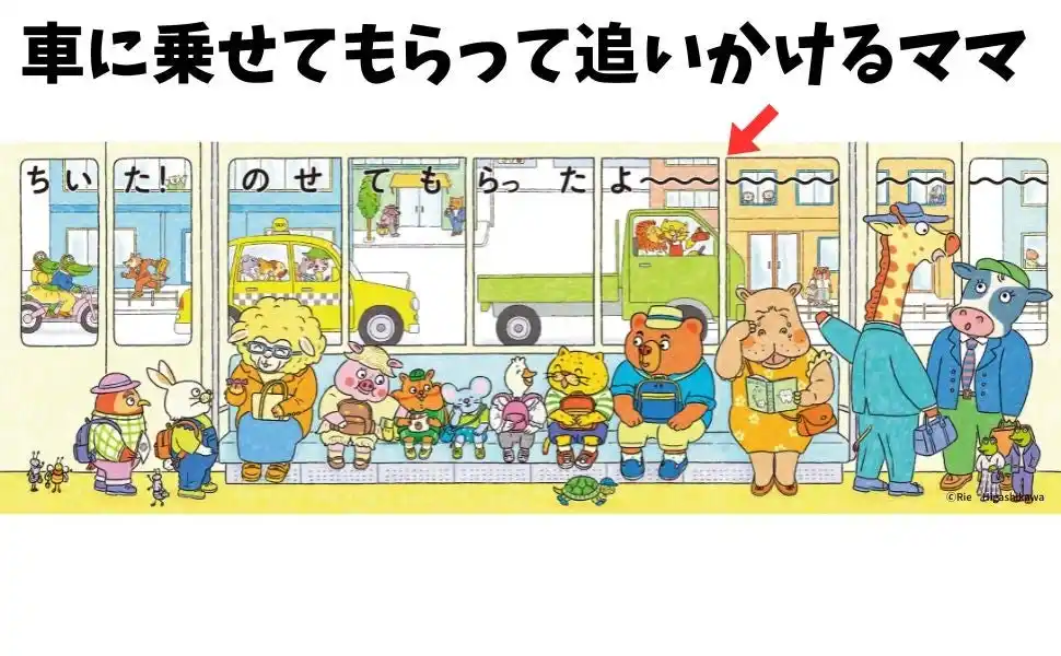 | 何とか気付いてもらおうとしているママと、応援する動物たち。そんな窓の外の様子に全く気付かず平和に遠足を楽しんでいる電車内とのギャップがまた面白い! | |||||||||||||||||||