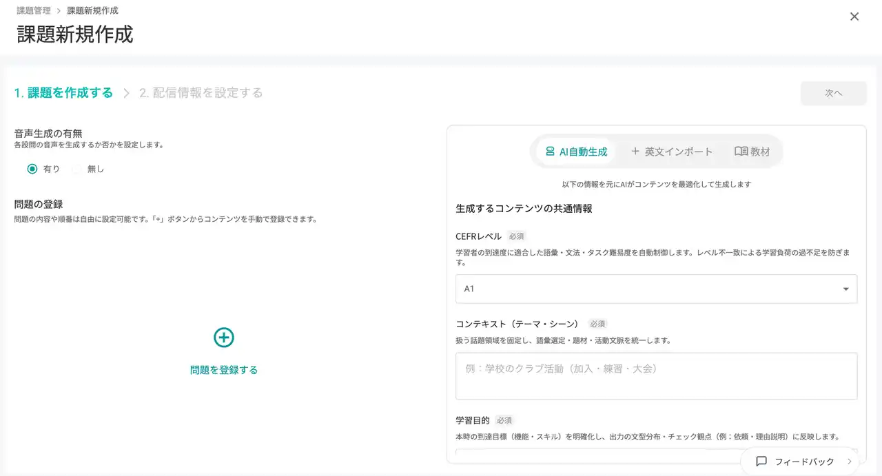 教員用の課題作成画面。コンテキストや学習目的などの設定と、問題形式(音読、単語、AIとのロールプレイなど)を選択するだけで簡単に課題を作成。先生のお手持ちの英文をインポートして問題作成することも可能です。 |