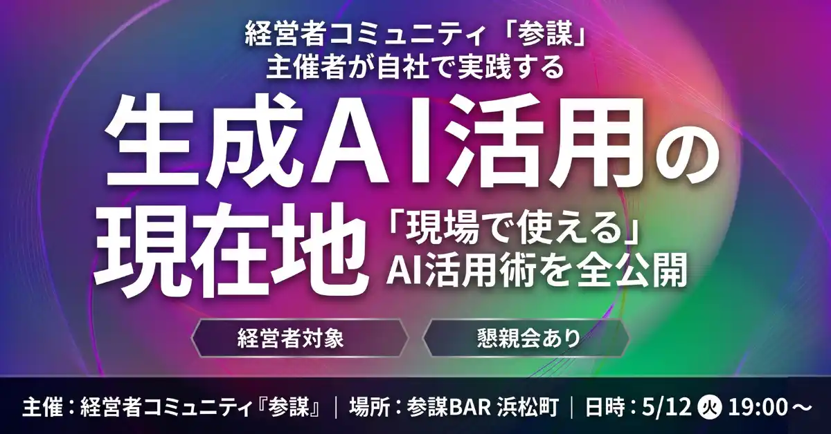 経営者コミュニティ「参謀」を運営する株式会社経営参謀(本社:東京都新宿区、代表取締役:新谷 健司)は、2026年5月12日(火)に、「生成AI活用の現在地 ~経営者コミュニティ「参謀」主催者が自社で実践する「現場で使える」AI活用術を全公開~」と題した勉強会を、参謀BAR浜松町(東京・浜松町)で開催します。本勉強会では、代表の新谷が「生成AI実践会」などの最前線で学んだ最新知見と、自社業務への具体的な落とし込み方を包み隠さず公開します。 |
