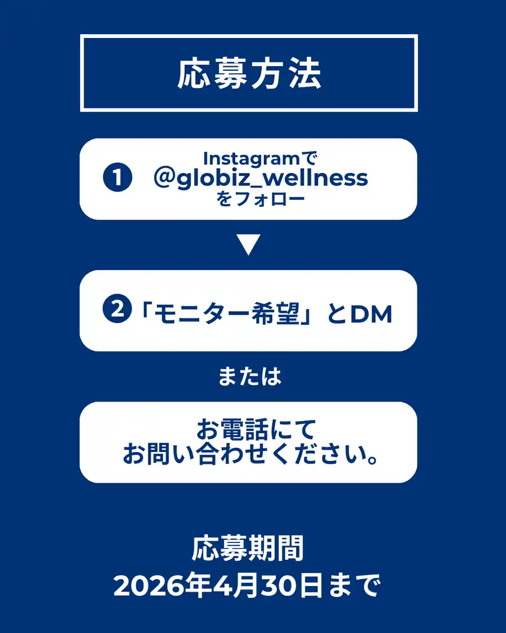 当選のご連絡は、Instagram公式アカウント @globiz_wellnessまたは、弊社お電話口からのみ行います。偽アカウントや不審な連絡には十分ご注意ください。 |
