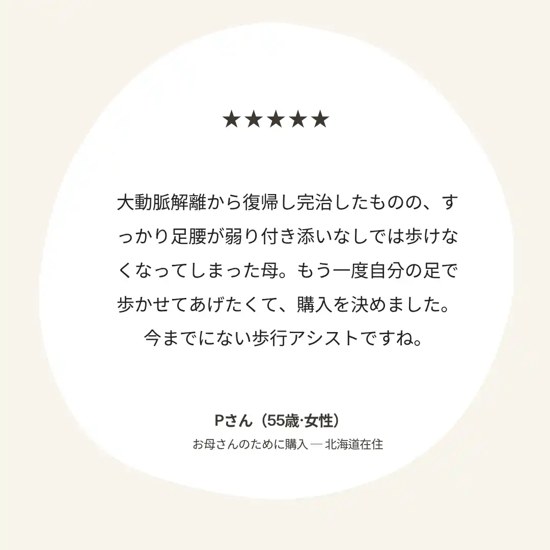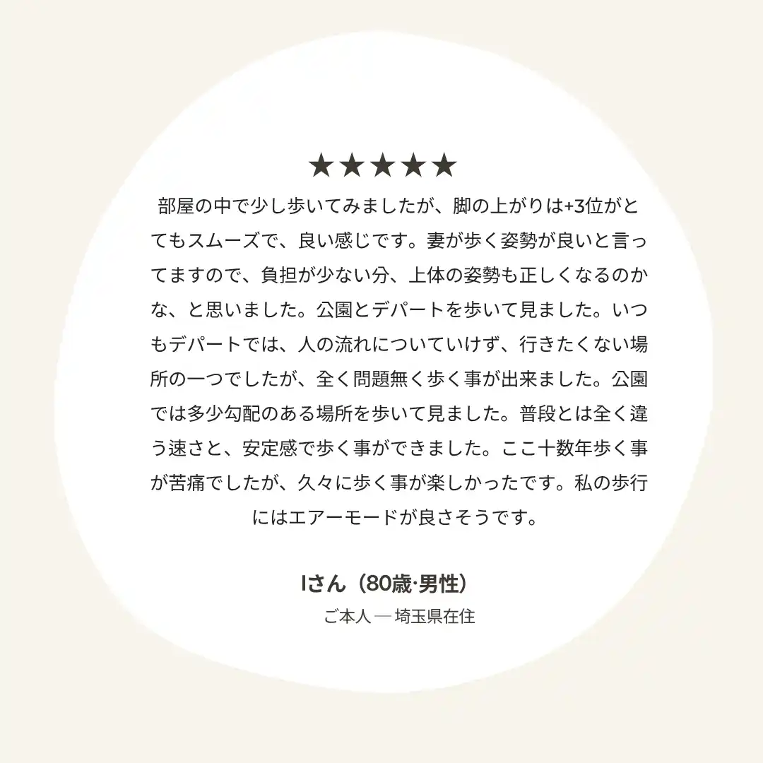 「周りの方からの反応はどうだったか?」 など、あなただからこそ感じた「歩く喜びの変化」をぜひ率直に教えてください。 |