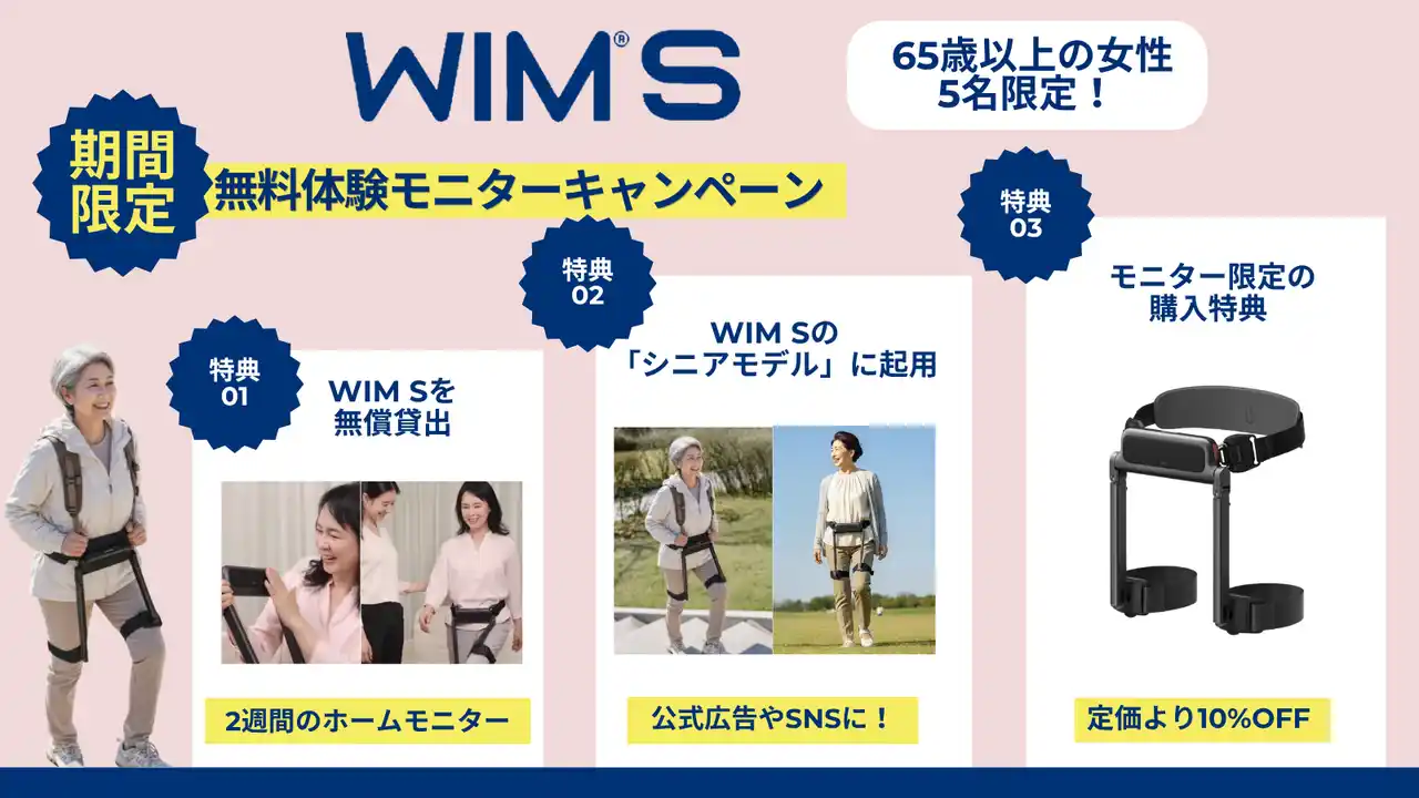 歩行支援ロボット『歩行革命ギア WIM S』を展開する株式会社グロービズは、4月16日(木)より、製品の驚きの軽やかさを日常生活の中でじっくりとご体感いただける「2週間無料ホームモニター」の募集を開始いたします。 |