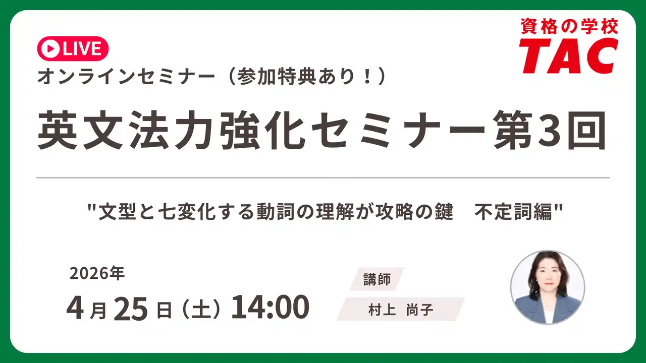 TAC株式会社(以下、TAC)は、(東京都千代田区)は、TOEIC(R) L&R TEST対策講座の一環として、無料オンラインセミナー「英文法力強化セミナー 第3回 ~文型と七変化する動詞の理解が攻略の鍵 不定詞編~」を2026年4月25日(土)にライブ配信にて開催いたします。 |