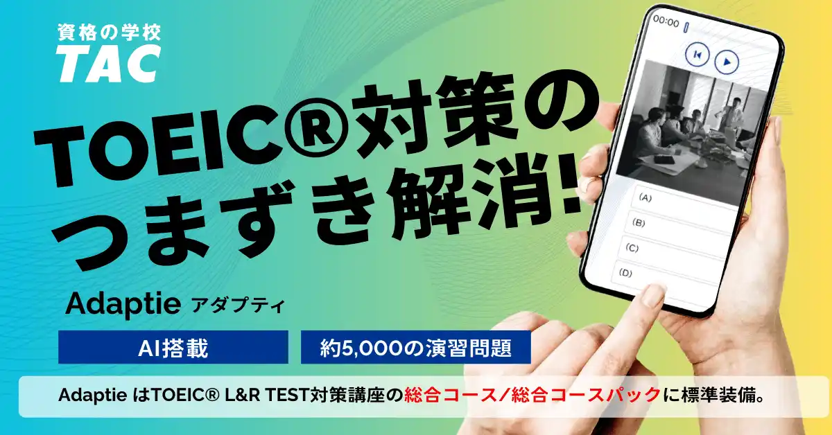 TACのTOEIC対策講座で本格的にスコアアップを目指しませんか?TACの講師講義とAI搭載アプリ「Adaptie」が融合。AIが弱点を分析し、最適問題を自動出題するパーソナライズ学習で、無駄なく効率的に目標スコア突破を実現します。 |