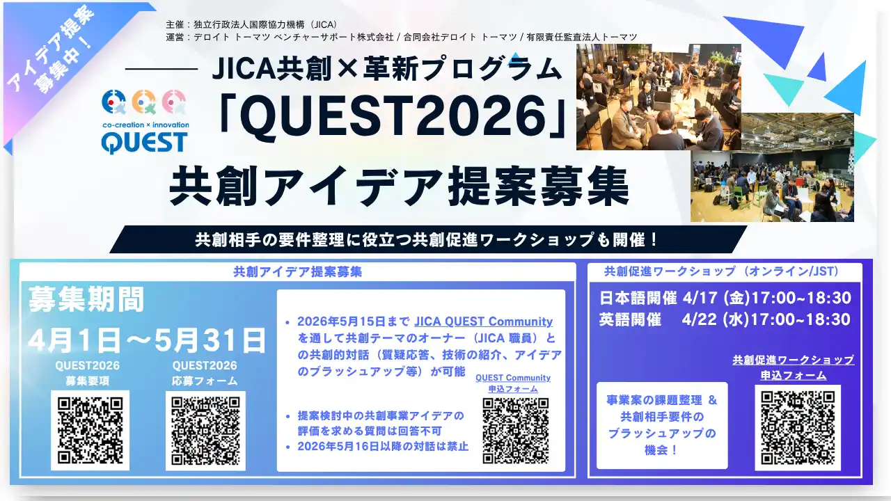 JICA主催、デロイトグループ運営の “共創×革新プログラム「QUEST」2026”の共創アイデア募集開始のご案内です。2年目となる今回は、JICAの注力テーマに対する共創・革新の事業アイデアを広く募集します。JICA共創テーマへの提案に加え、応募者ご自身が設定するテーマでの応募も可能です。 |