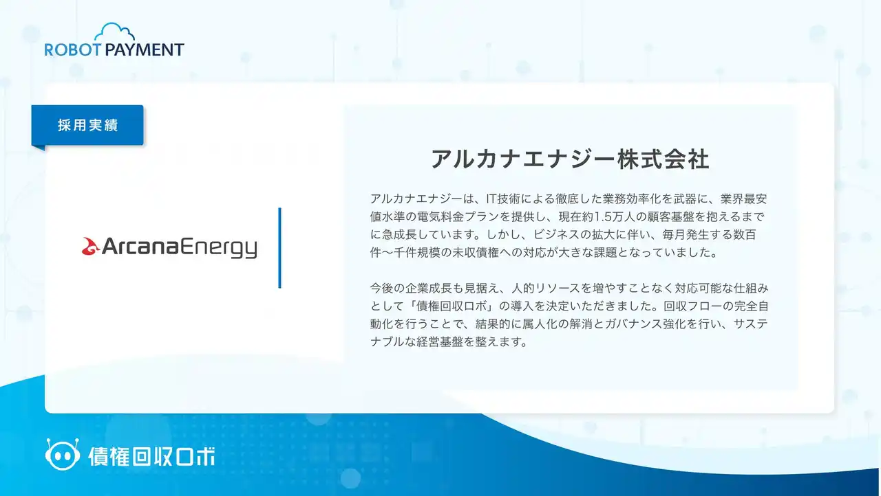企業のお金の流れを円滑にし、新たな価値創造を促進する株式会社ROBOT PAYMENT(本社:東京都渋谷区、代表取締役執行役員CEO:清久 健也、証券コード:4374、以下 当社)は、督促・回収のデジタルインフラ「債権回収ロボ」が、アルカナエナジー株式会社(本社:東京都港区、以下 アルカナエナジー)に採用されたことをお知らせします。 |