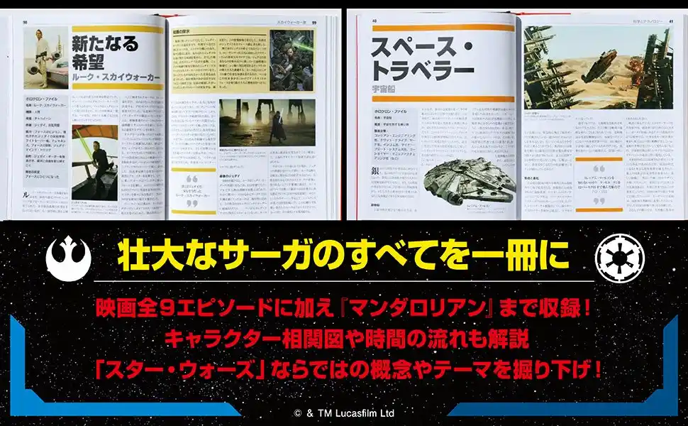 読み物としても充実の内容で、単なる事典にとどまらず、キャラクター相関図や時間の流れにまで言及。『スター・ウォーズ』ならではの概念やテーマを掘り下げた、初心者からコアなファンまで楽しめる解説文が見どころです。 |