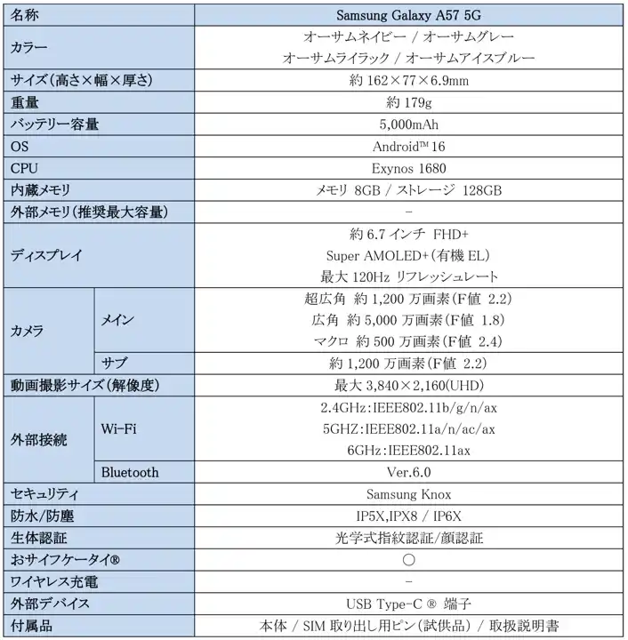 <主な仕様:「Samsung Galaxy A57 5G」> |