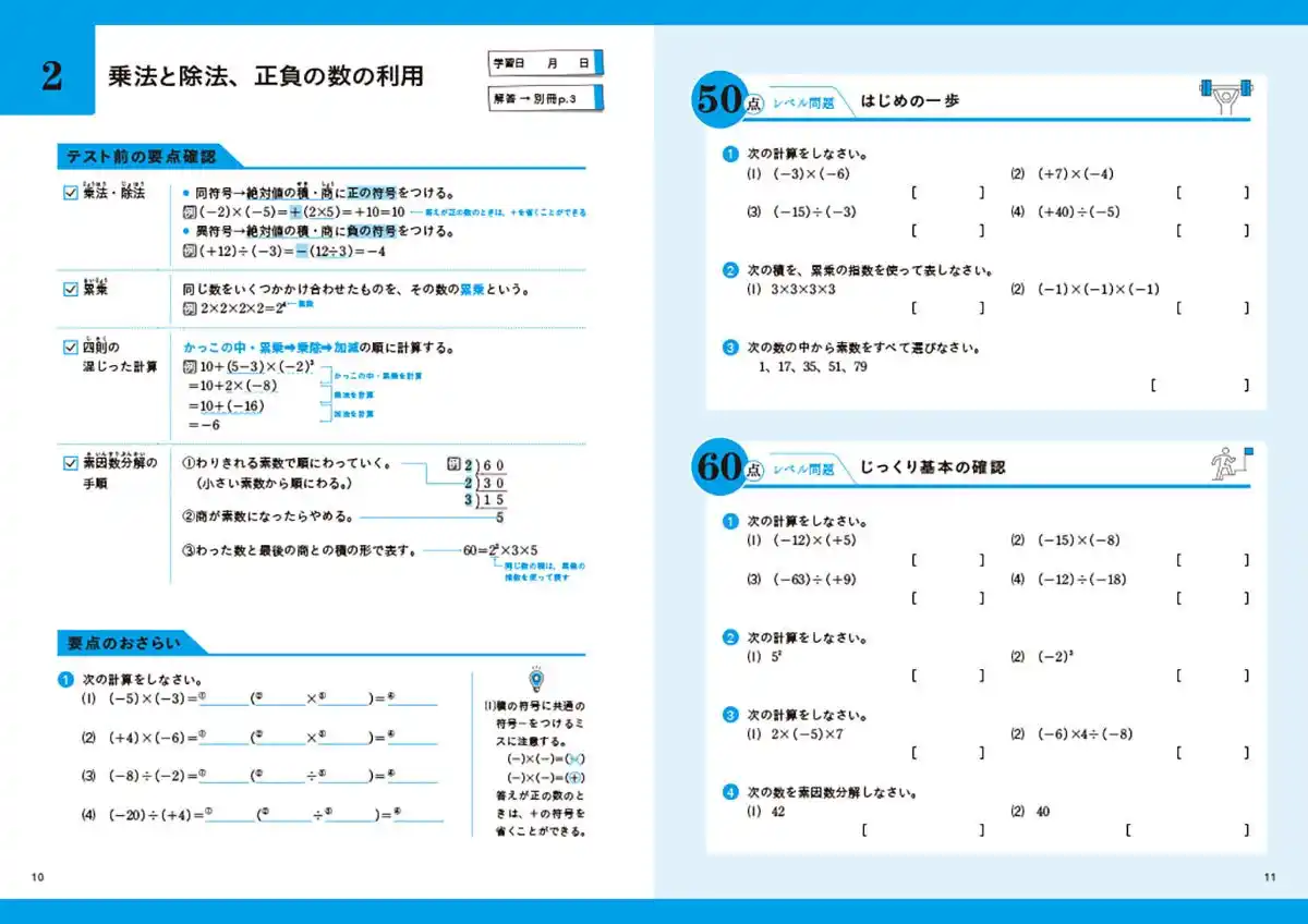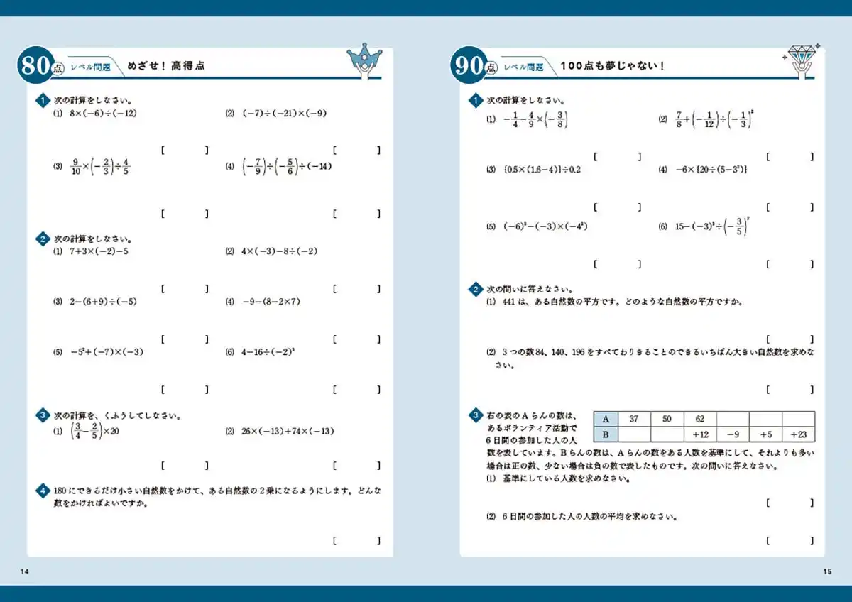 ▲「中1数学」より。「テスト前の要点確認」~「90点レベル問題」(※紙面はイメージです) |