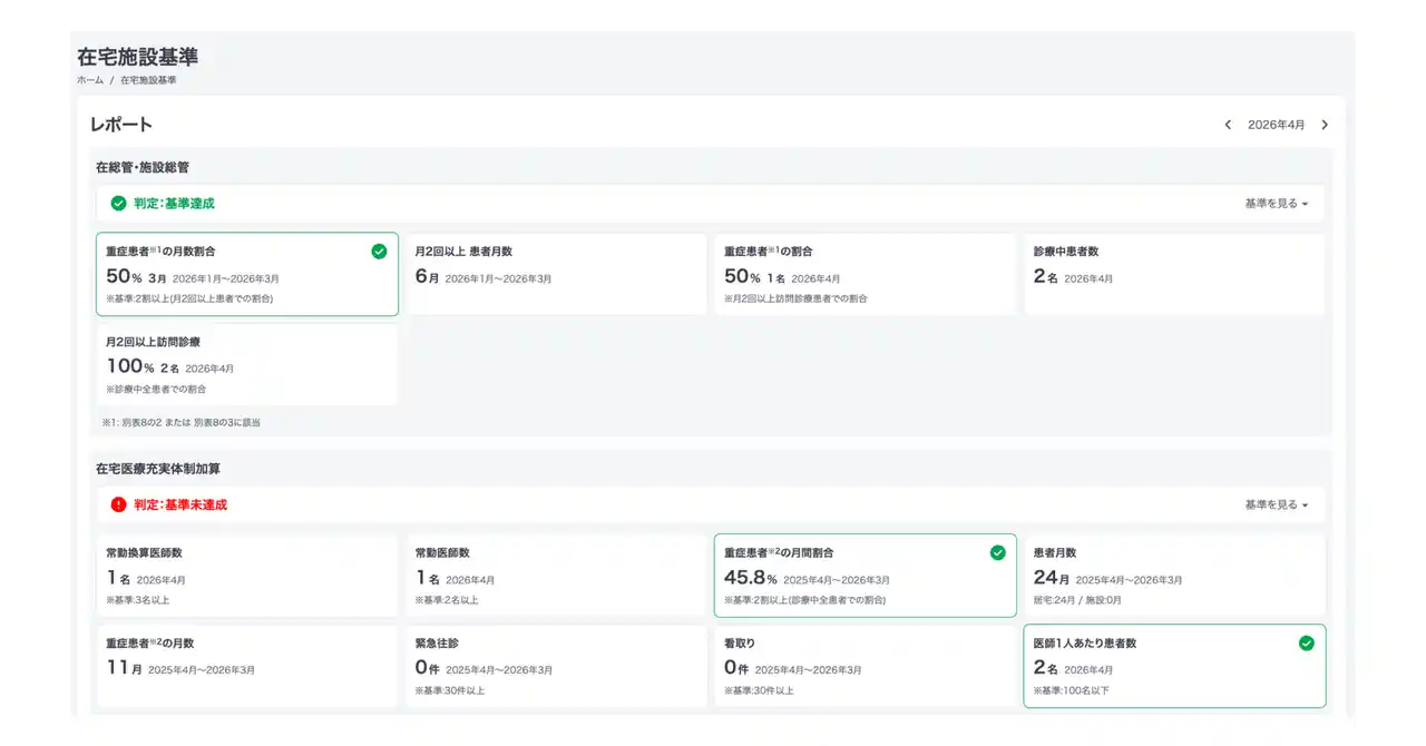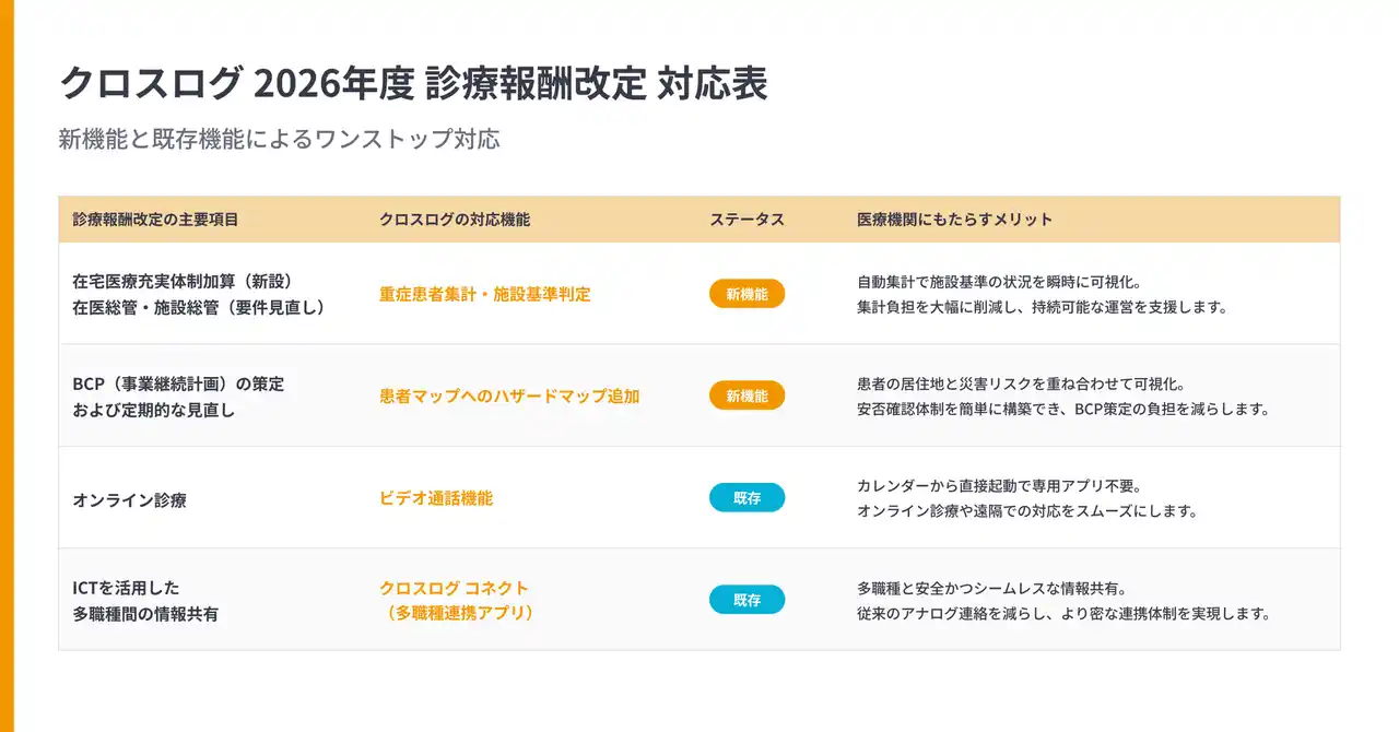 クロスログ株式会社(福岡市博多区、代表取締役CEO:宮原智新)は、在宅医療DX支援サービス「CrossLog(クロスログ)」において、2026年度(令和8年度)診療報酬改定の在宅医療における対応をサポートする新機能として、施設基準の自動判定機能およびハザードマップ機能をリリースしたことをお知らせいたします。 |