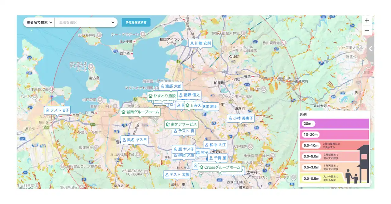 ・災害リスクの可視化: 患者の居住地マップ上に、地域のハザードマップをワンクリックで重ね合わせて表示。 |