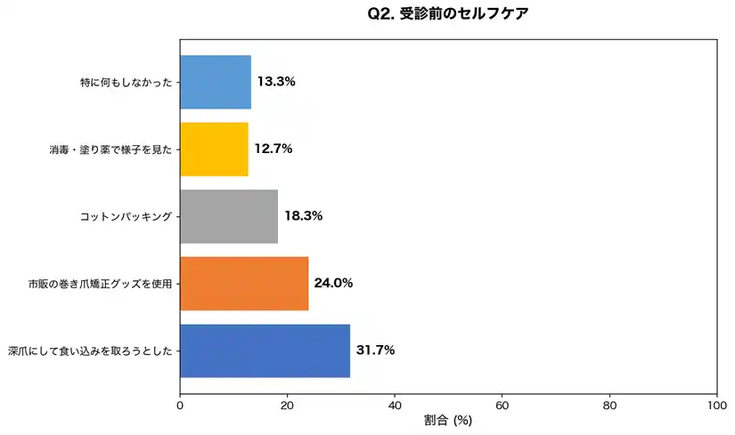 | 本調査では86.7%がセルフケアを試み、そのうち47.7%が悪化を経験しています。特に「深爪にして食い込みを取る」行為は31.7%が行っていましたが、これは陥入爪を悪化させる最大の原因です。軽度の巻き爪であればコットンパッキングや市販の矯正具が有効な場合もありますが、痛みや炎症がある場合は医療機関での治療が必要です。 | ||||||||||||||||||||||||||||