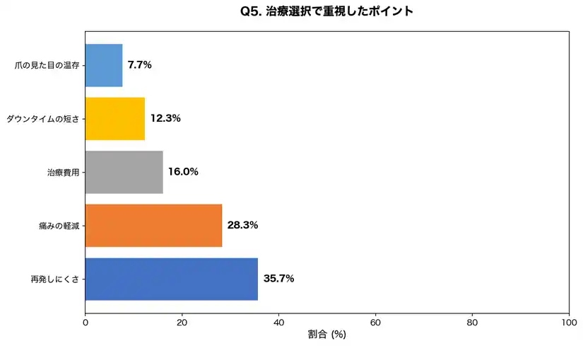 | 治療選択において「再発しにくさ」を最も重視する患者が35.7%と最多でした。陥入爪は再発しやすい疾患であり、繰り返す痛みに悩まされてきた経験から、根治性を求める傾向が強いことがわかります。 | ||||||||||||||||||||||||||||