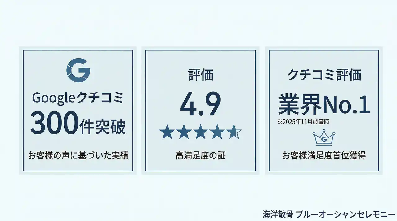 | その結果、Googleクチコミ平均評価は4.9/5を記録し、第三者調査において主要海洋散骨サービスの中でGoogleクチコミ評価“業界No.1”を獲得しています。 | |||