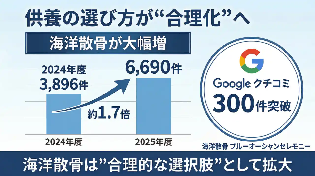 | これは、海洋散骨が一般化し、利用者が比較・検討のうえで納得して選ぶフェーズに入っていることを示しています。 | |||