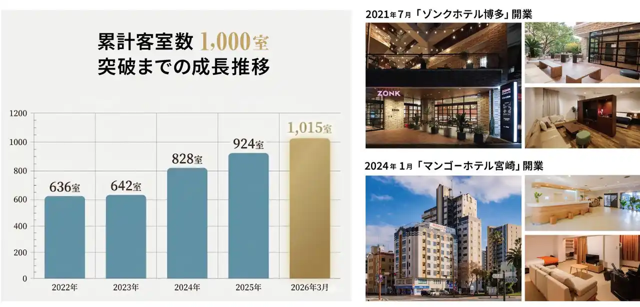 株式会社ホテリエ(所在地:福岡県福岡市、代表取締役:笹栗 泰典、以下:弊社)は、2026年3月時点において、管理および運営受託を行う累計客室数が1,000室を突破いたしました。 福岡を起点に、宮崎、鹿児島、そして東京へとエリアを拡大し、地方都市から首都圏に至るまで急成長を遂げております。 |