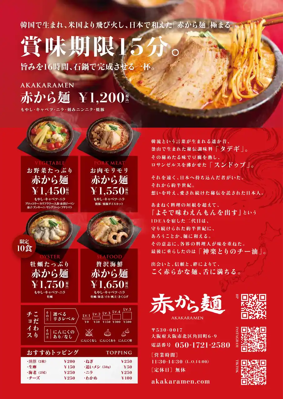 | 株式会社イデア(取締役COO:淀井)は、2026年5月1日(金)大阪・梅田に新ブランド「赤から麺」をオープンします。韓国からロサンゼルス、日本へ。世界を巡って磨かれた“コク辛”の一杯 |