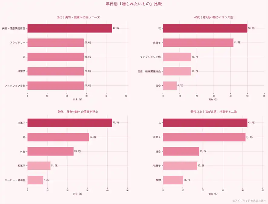 また、年代によって希望するギフトが異なることから、贈る相手の年代や嗜好に合わせた選択が重要であると考えられます。 |