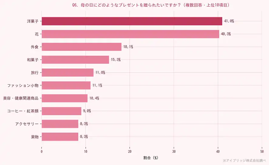 「花」(38.7%)が最も多く、「洋菓子」(33.7%)が続きました。食べ物系ギフトも多く選ばれており、一定のニーズがうかがえます。 |