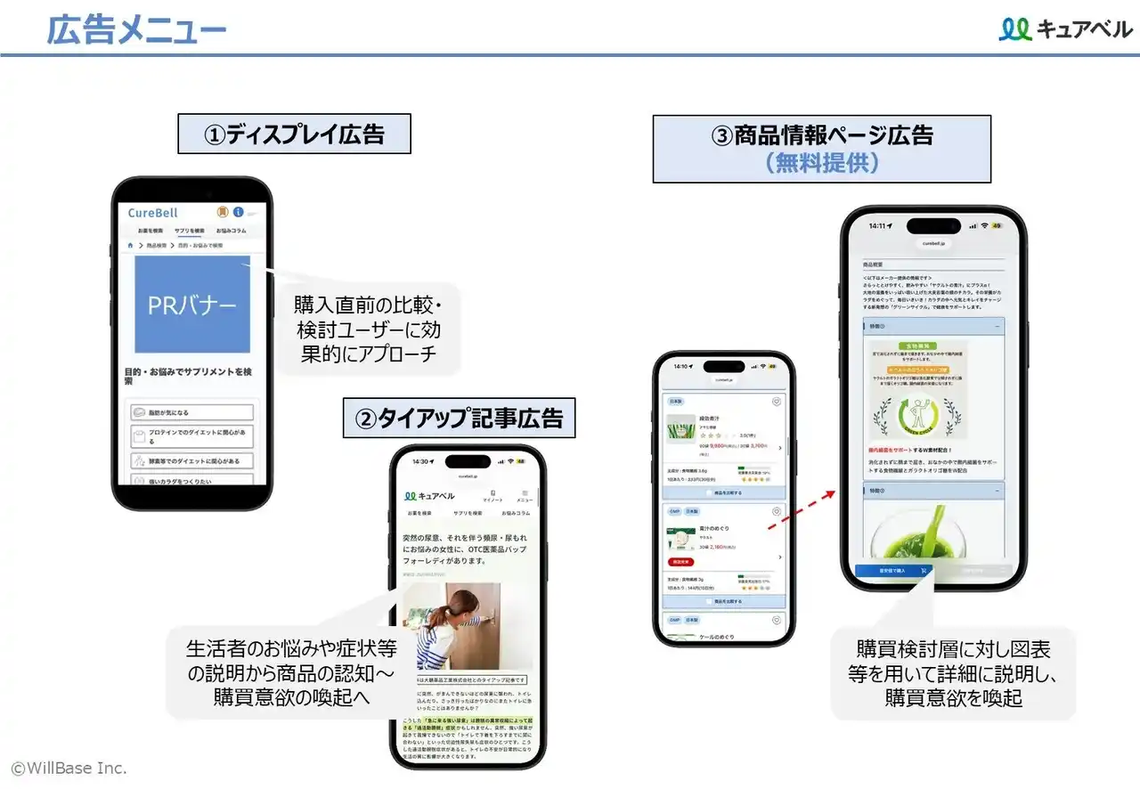 ヘルスケア関連メーカー様に対し、キュアベルの購買意欲の高いユーザー層へアプローチできる広告・マーケティング支援メニューを拡充し、商品認知から購買、ファン化までを一気通貫で支援するソリューションを提供します。 |