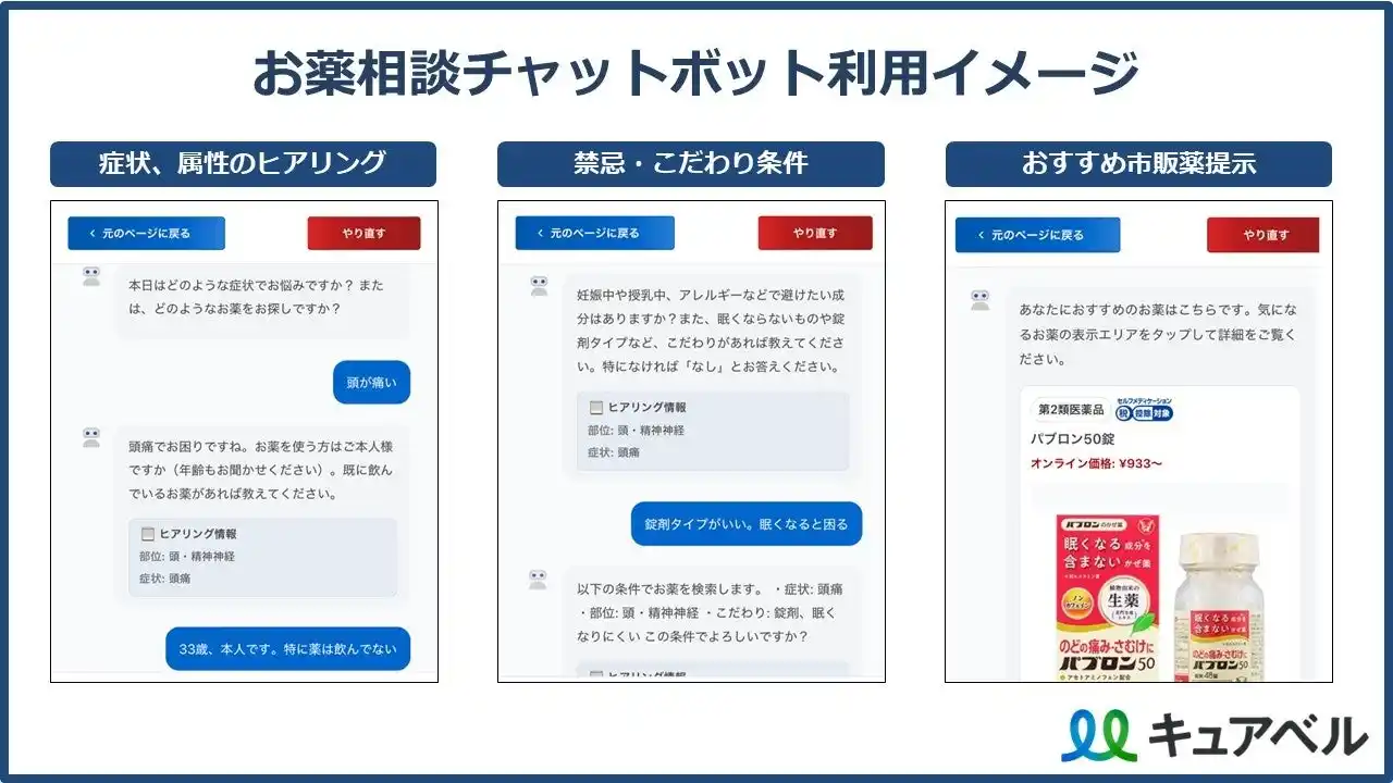 本サービスは、ユーザーから「症状・年齢・服用中の薬」などを詳細にヒアリングし、おすすめの市販薬を提示する対話型AI機能です。本サービスのAIは、インターネット上の不確かな情報ではなく、キュアベル独自の構造化されたデータベース(添付文書情報等)を参照します。AI特有の誤情報(ハルシネーション)のリスクを極めて低く抑え、正確な根拠に基づいた回答を行います。