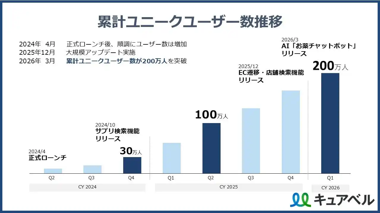 こうした基盤の上に、2025年12月の商品比較機能・店舗検索機能の追加、そして2026年3月のAI「お薬相談チャットボット」のリリースという二度の大型アップデートが成長を大きく加速させました。これらの機能拡充により、比較・検討から購入までをワンストップで完結できるサービスへと進化したことで、累計ユーザー数200万人の突破を実現いたしました。 |