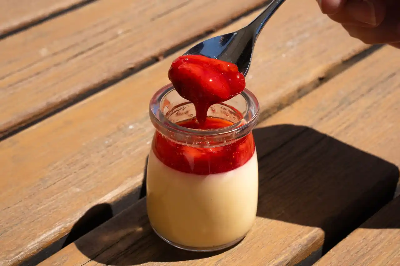 贅沢な完熟苺ソース プリンの上部には、苺の果肉をゴロゴロと残した特製ソースをたっぷりとかけました。苺本来の甘酸っぱさと香りが、濃厚なプリンの甘みを引き立てます。 |